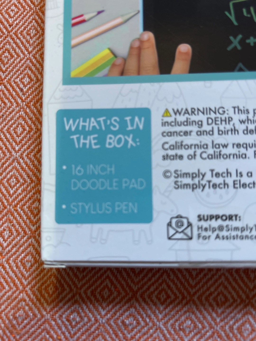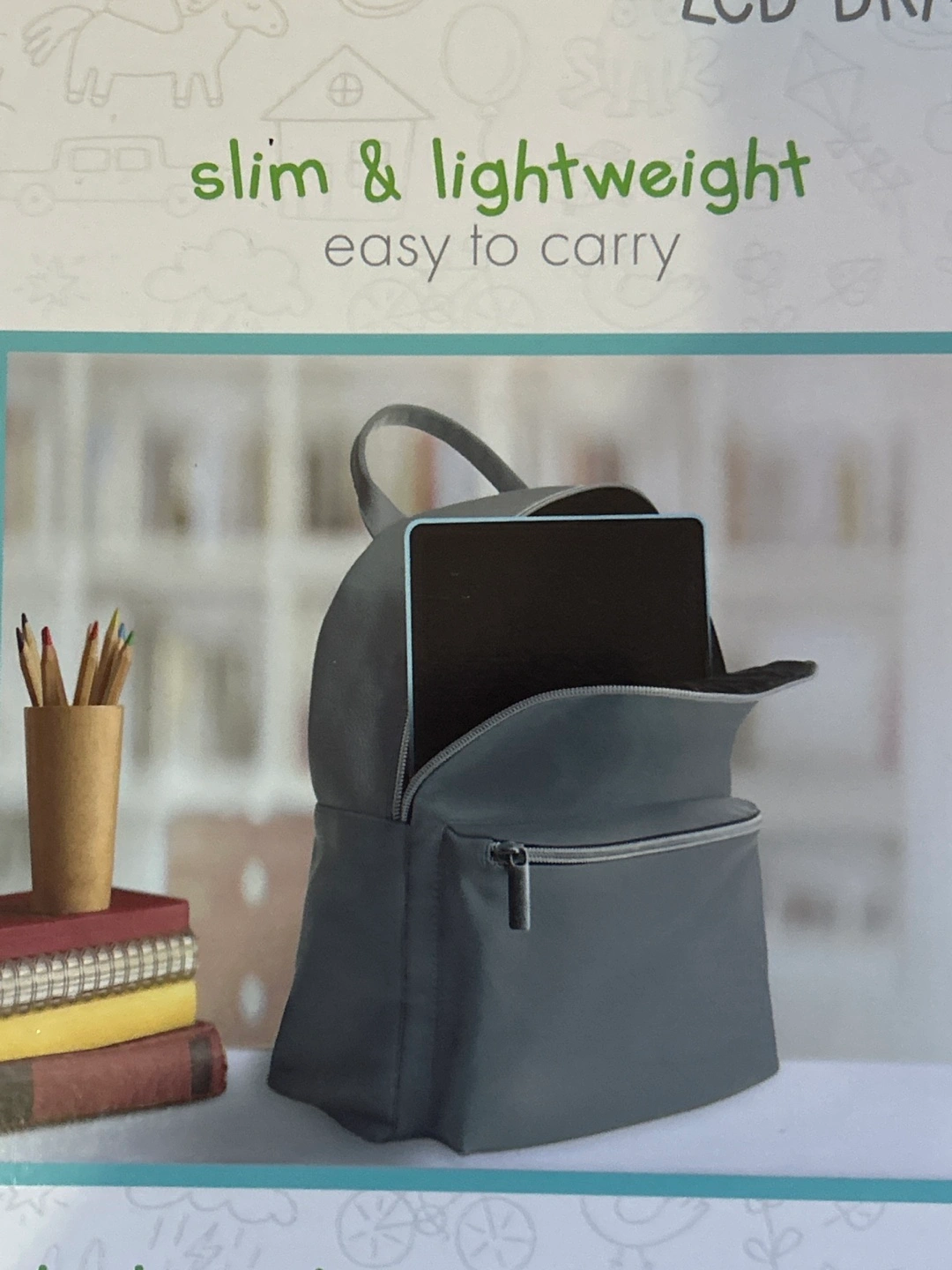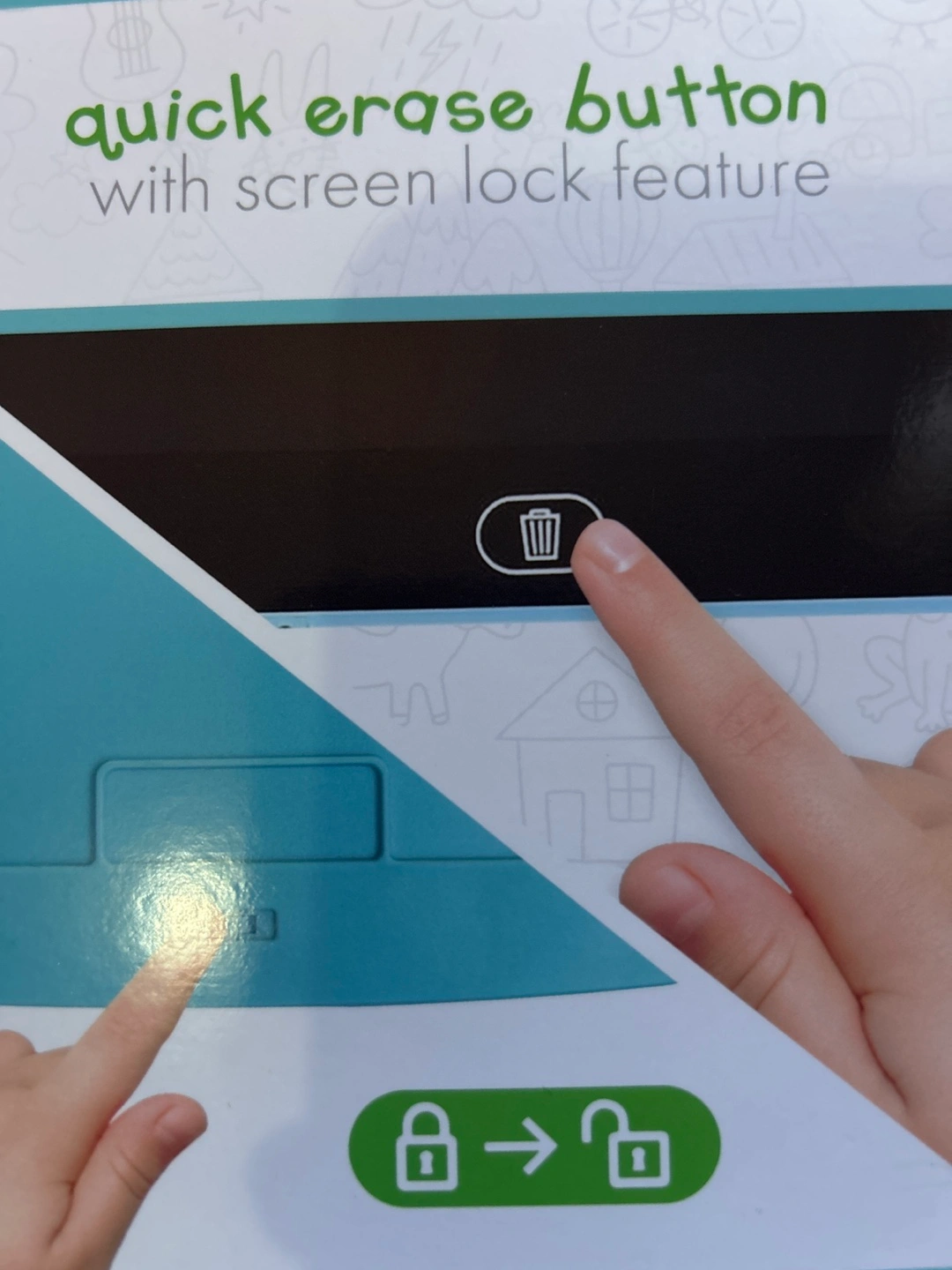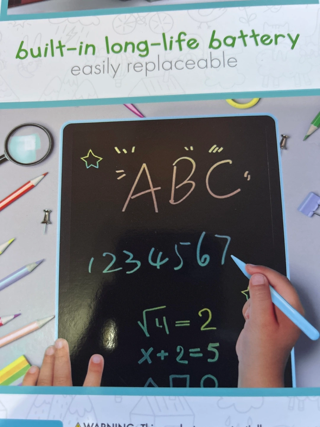 Extra large LCD drawing board. Includes stylus pen. Shock-resistant material. Built-in battery. Screen lock feature. Perfect for coloring, homework, memos, and more.