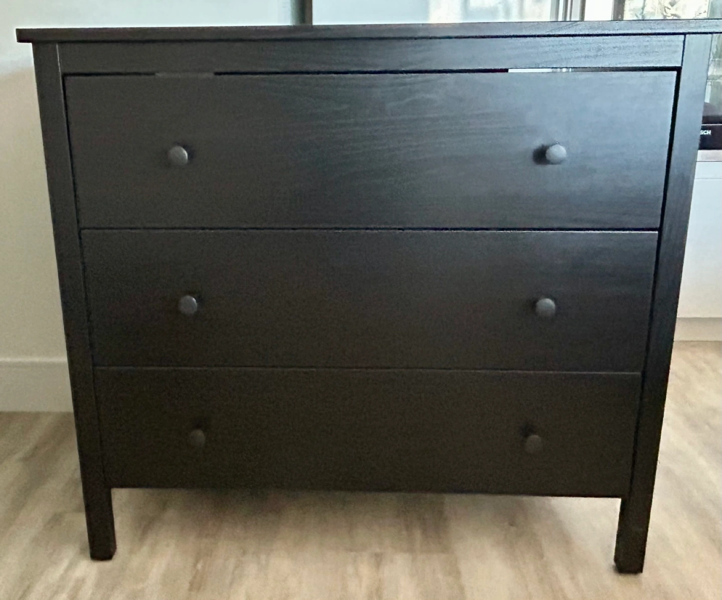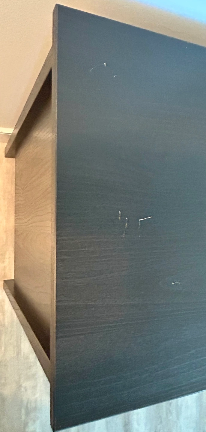 Pick up only. Barely used dark brown wood chest of drawers with three drawers. Small scratches on the top and side from move. Includes tools to anchor to wall to ensure no tip safety. Drawer measurements - 8”H x 29.5”W