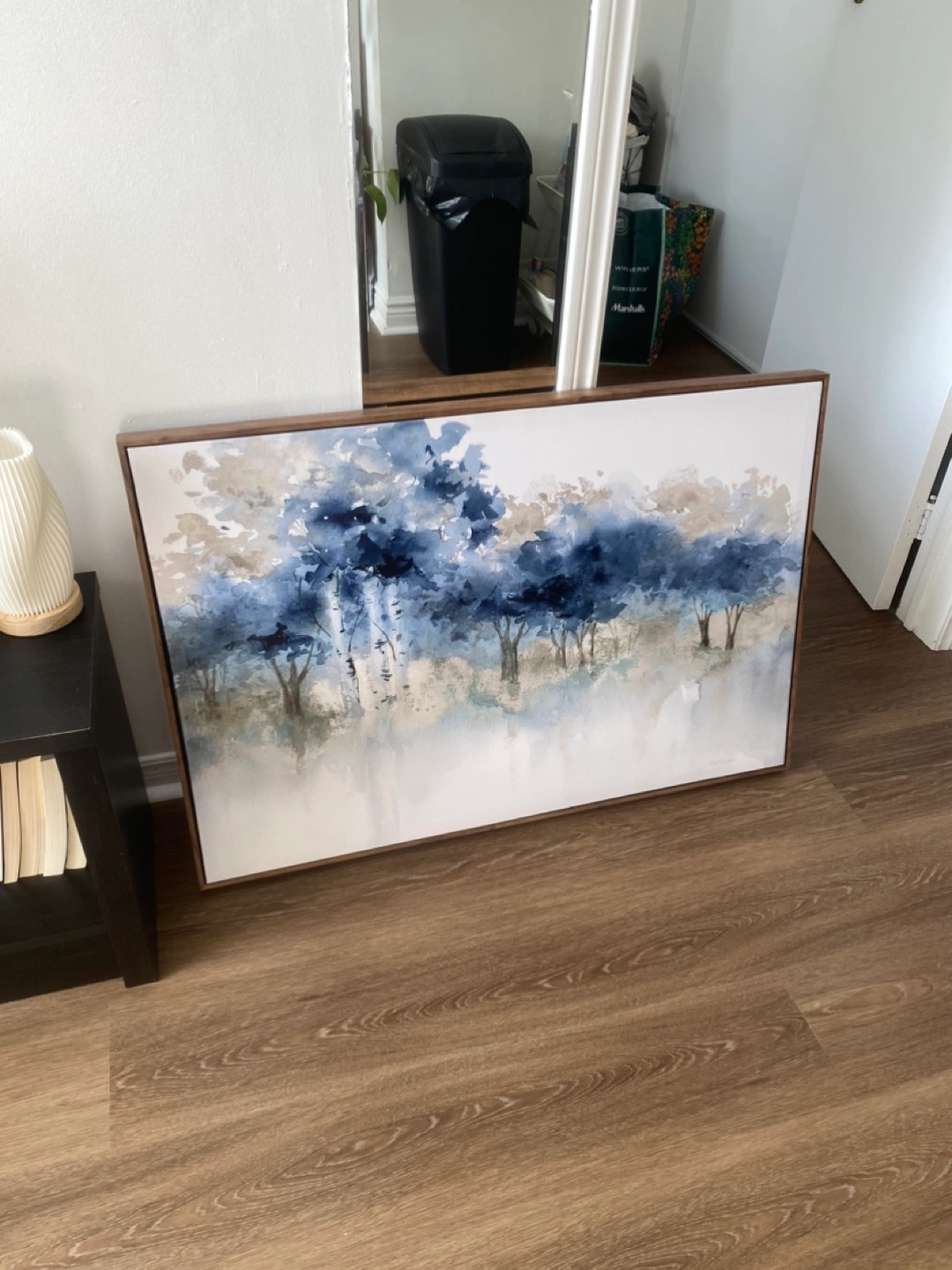 Wooden frame canvas wall art with a painting of watercolour trees originally purchased from Winners. Not sure of exact measurements but it’s pictured by my 32” tv for reference.