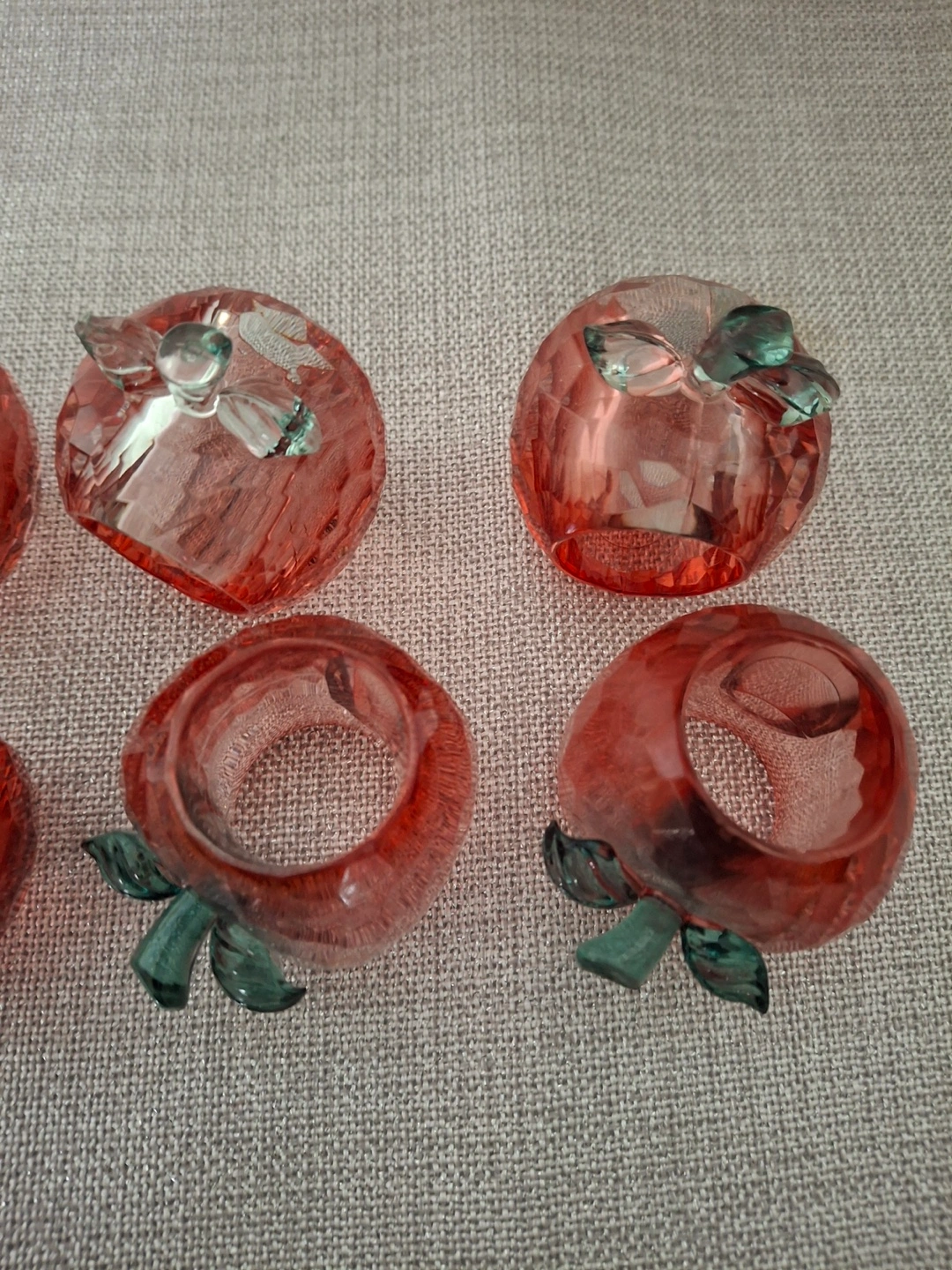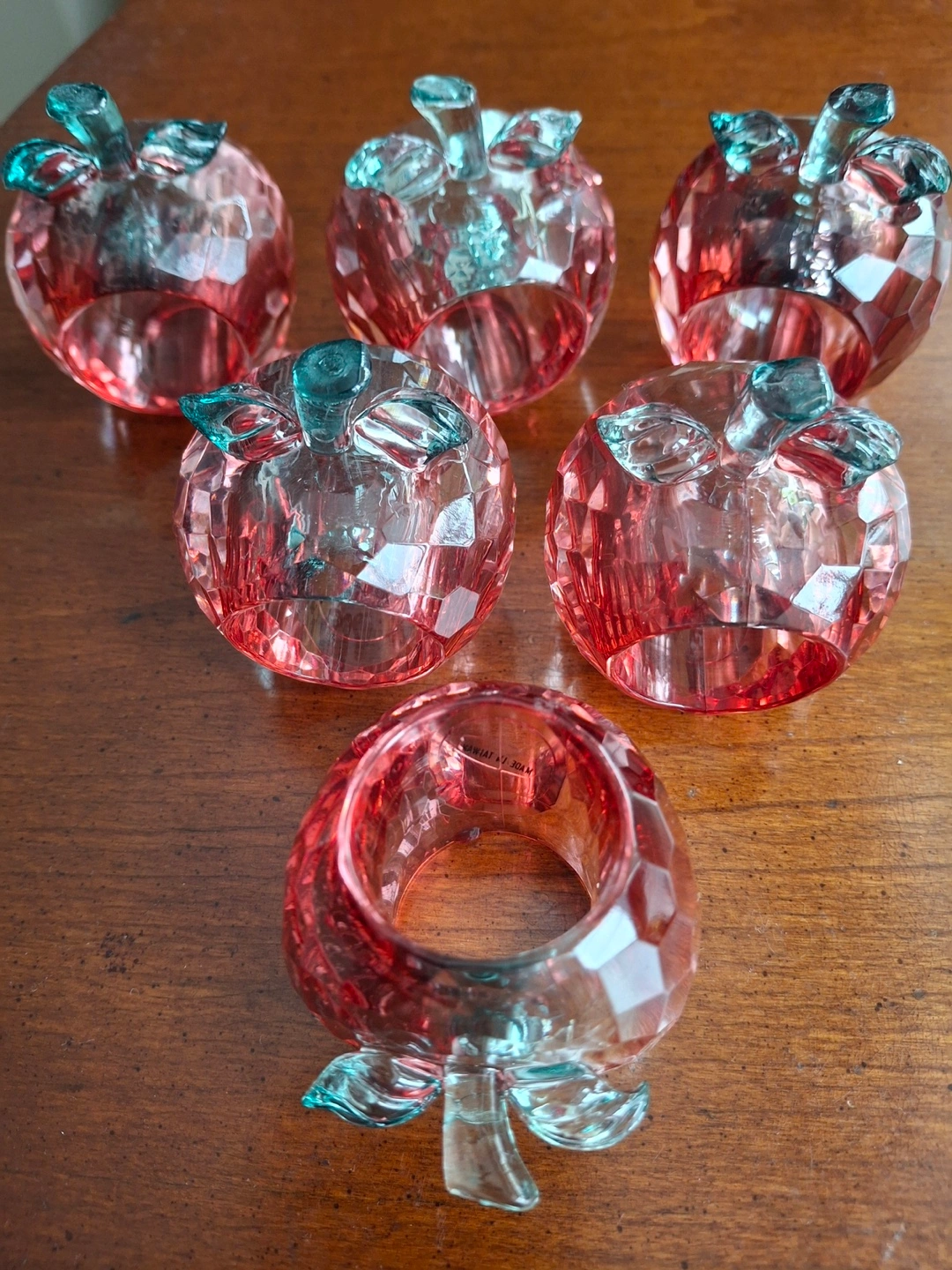 6 light red acrylic apple napkin rings. Stands 2.25” high with apple stem and 2 leaves. Textured to shine. Available for pickup in Markland Wood.
