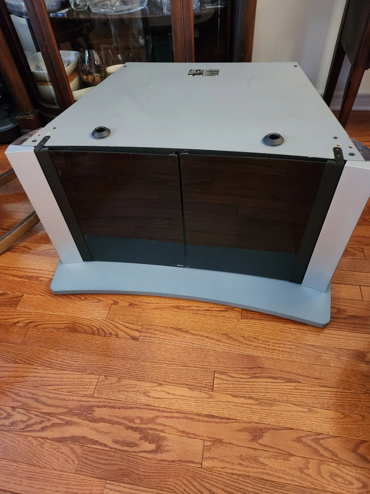 Two door cabinet with a glass front and a curved base. Made for a 32" Sony TV, but could be used for other televisions.