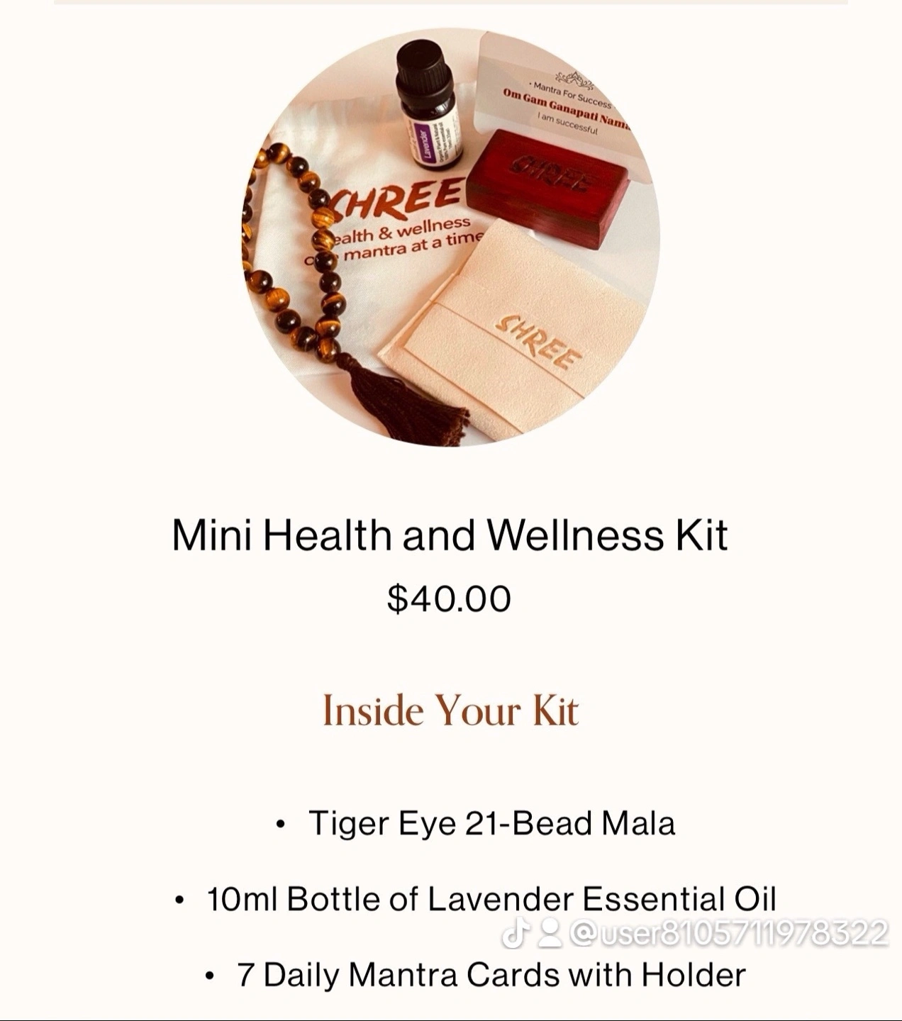 Tiger Eye Mala, 10ml Lavender Essential Oil and 7 Daily Mantra Cards with holder. Visit : myshree.ca