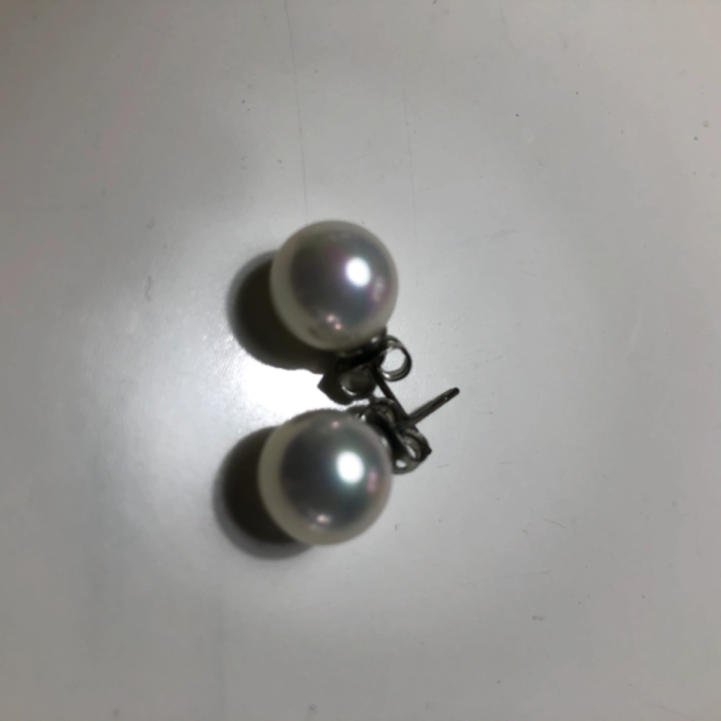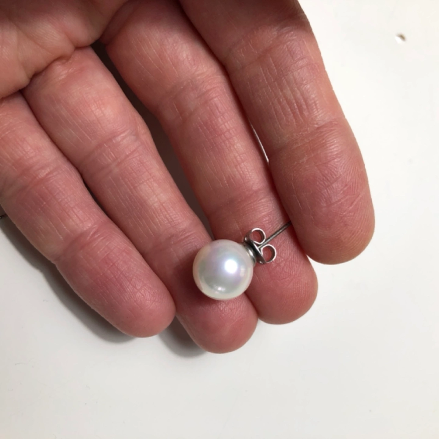 Pair of pearl earrings with silver posts. They are about 7 mm in diameter.