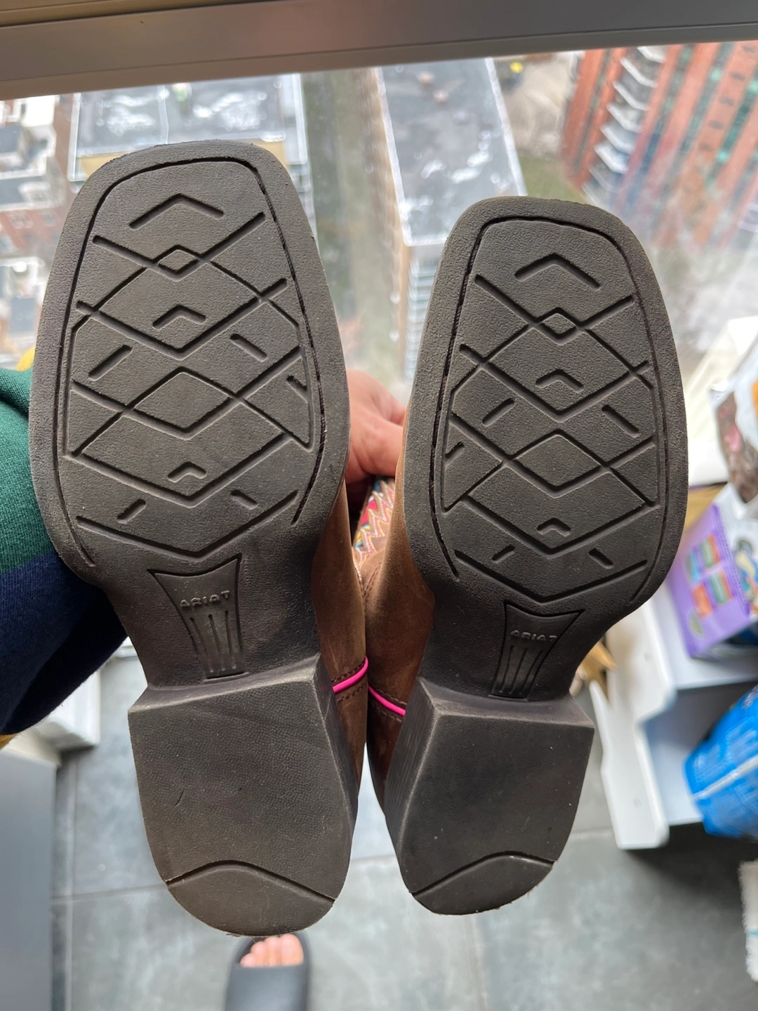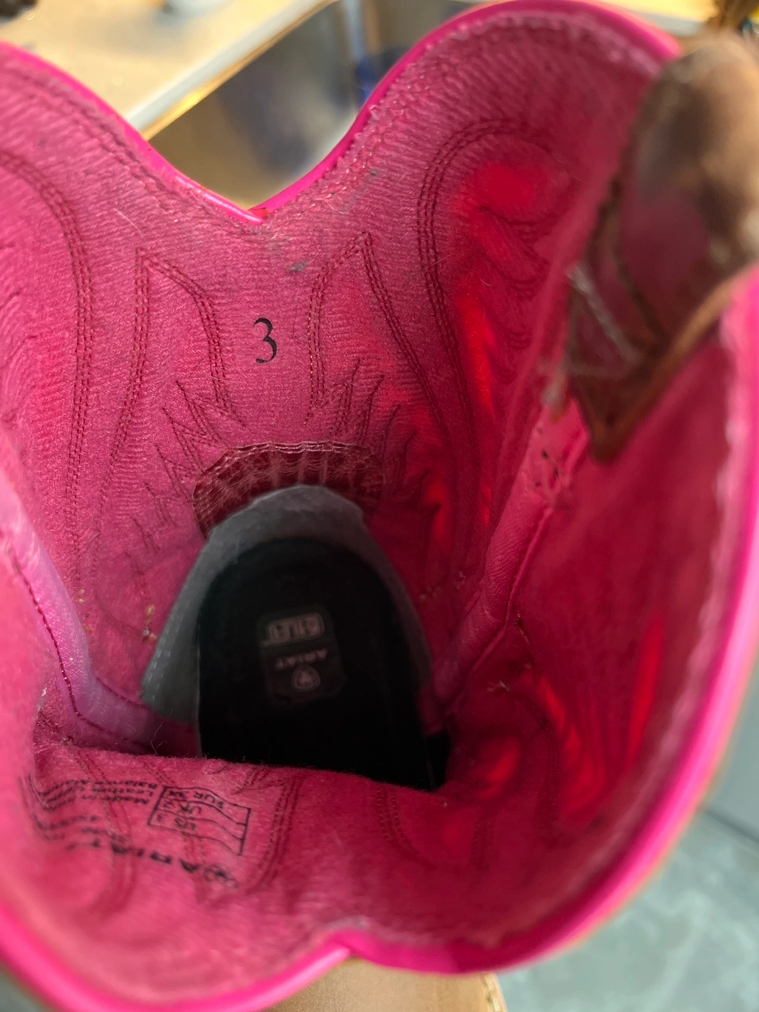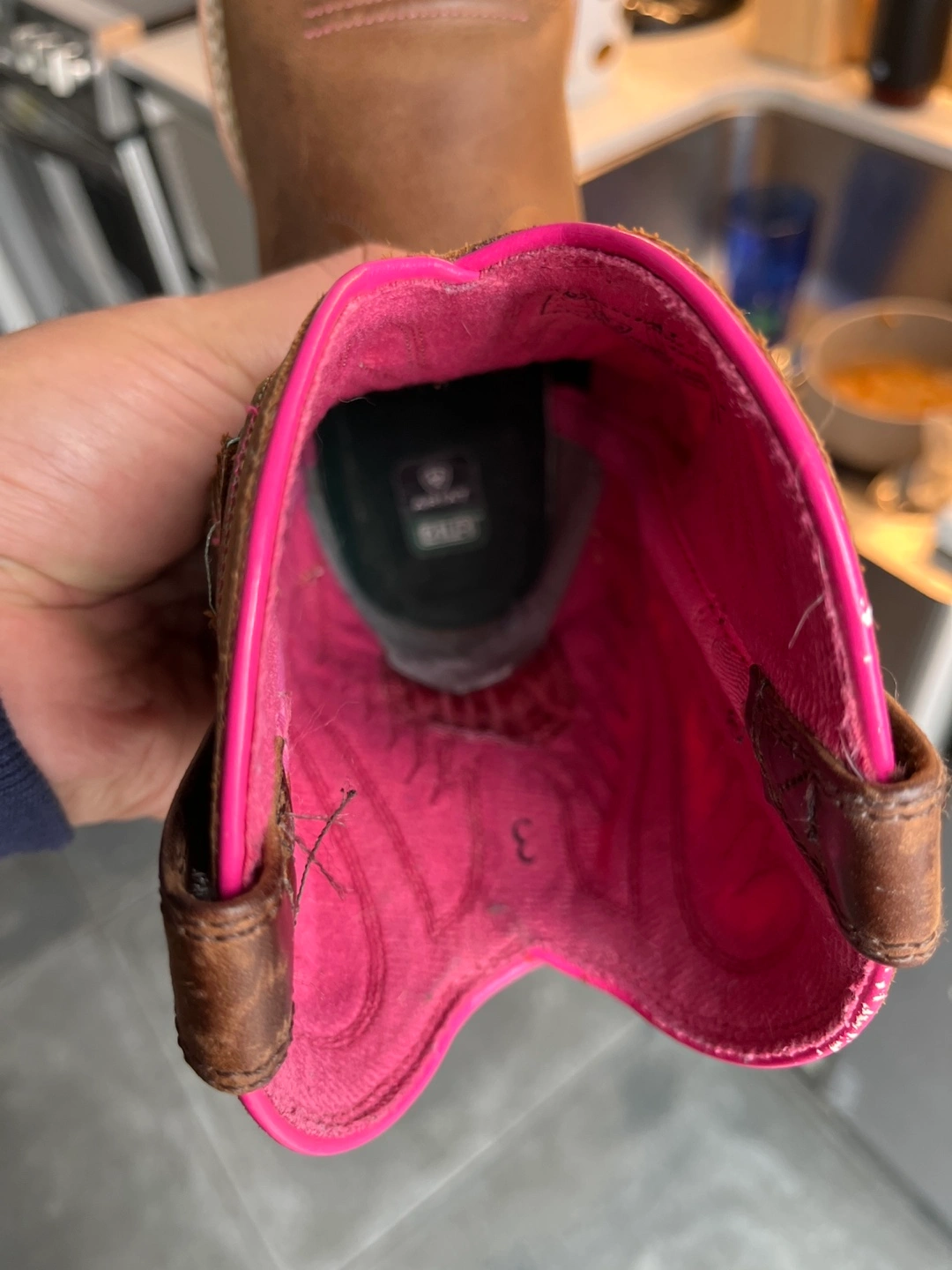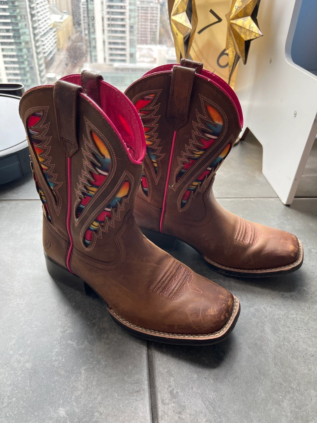 Toddler size 3.5 Brown leather cowboy boots with pink stitching and a colourful geometric pattern on the shaft. The boots have a square toe and a rubber outsole. Bought for Taylor Swift concerts. Slight wear.