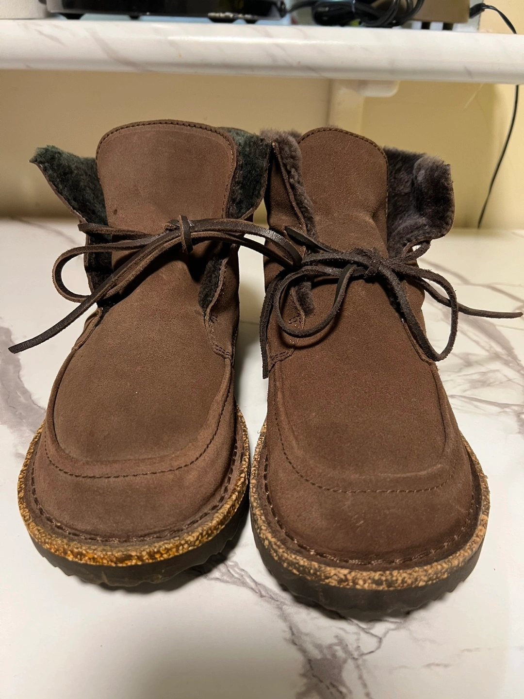 Brown suede boots with a lace up closure and fur lining.
