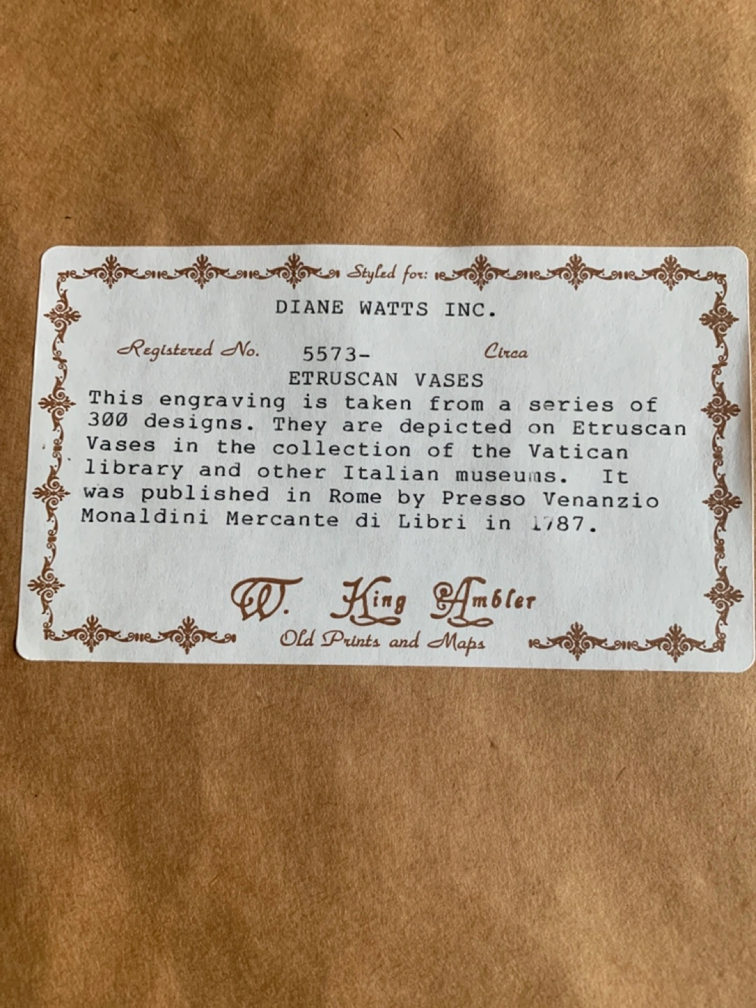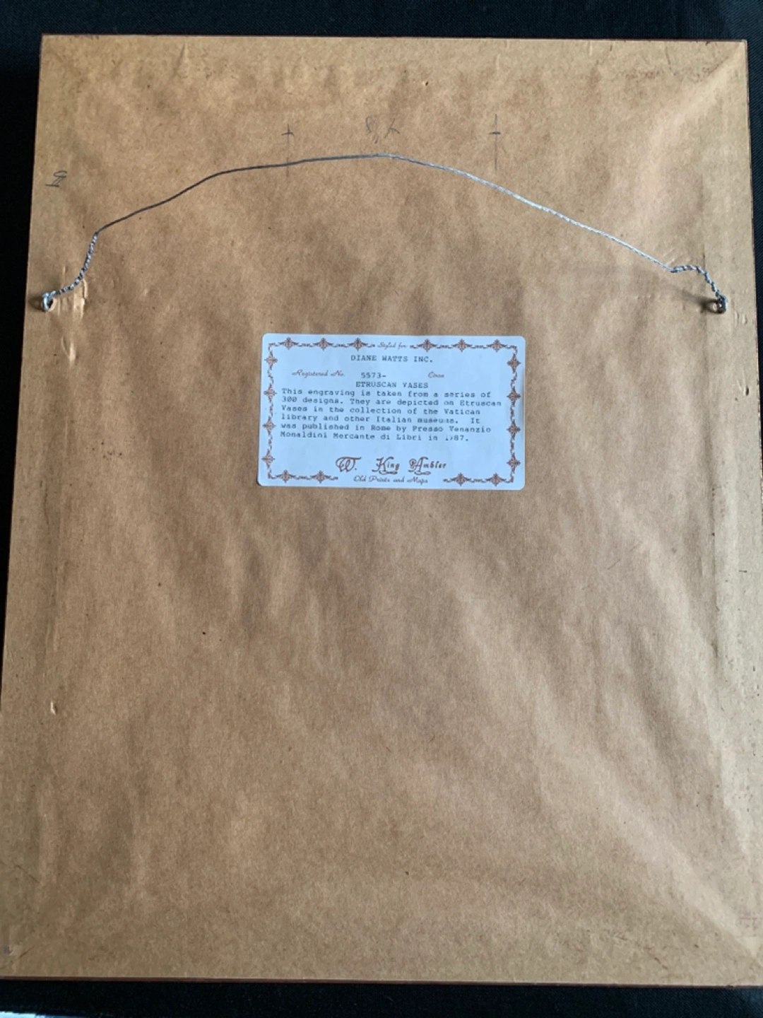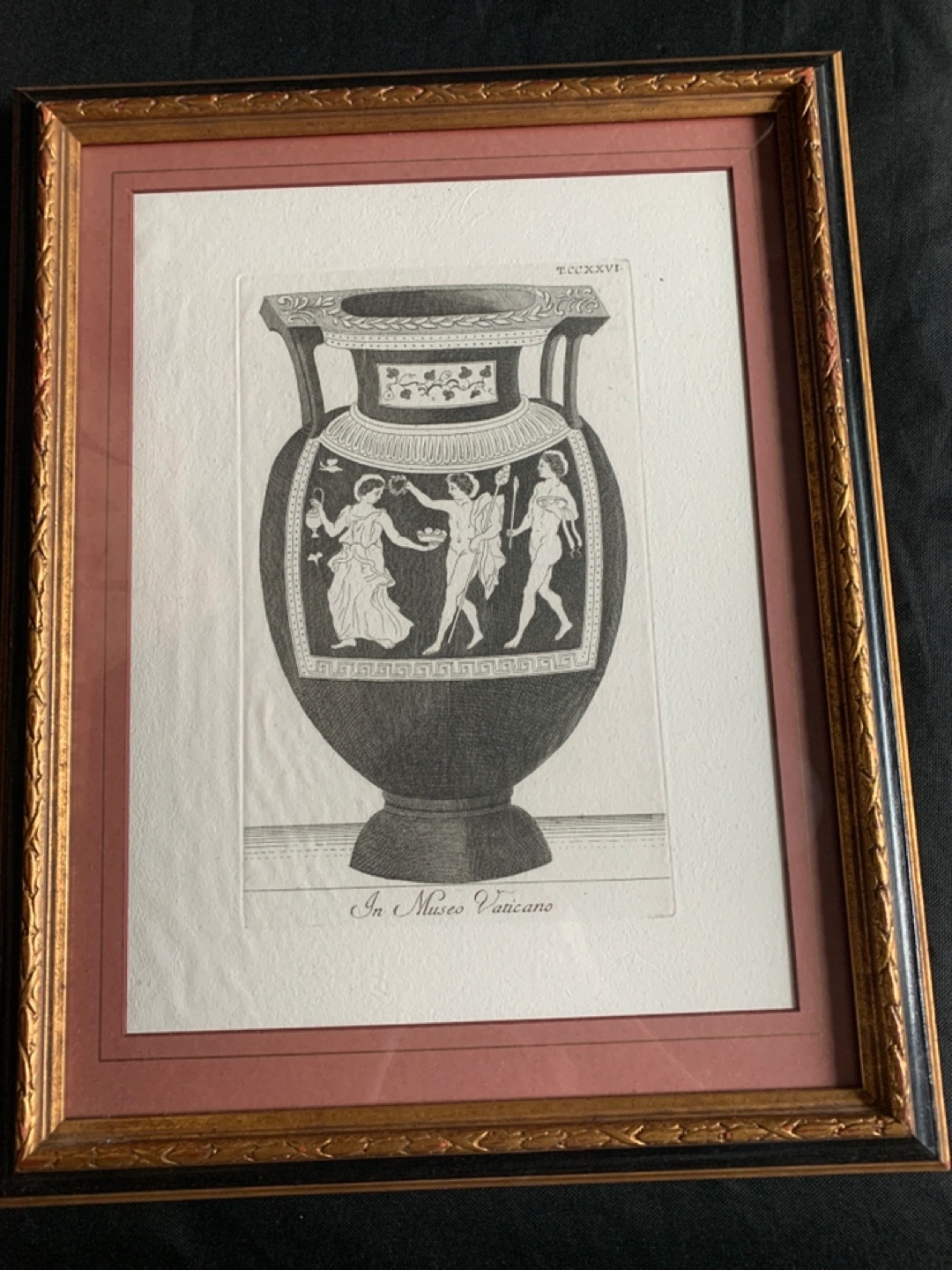 Framed antique engraving of an Etruscan vase. Taken from a series of 300 designs. Depicted in the Vatican Library and other Italian museums. Published in Rome by Presso Venanzio Monaldini Mercante di Libri in 1787.