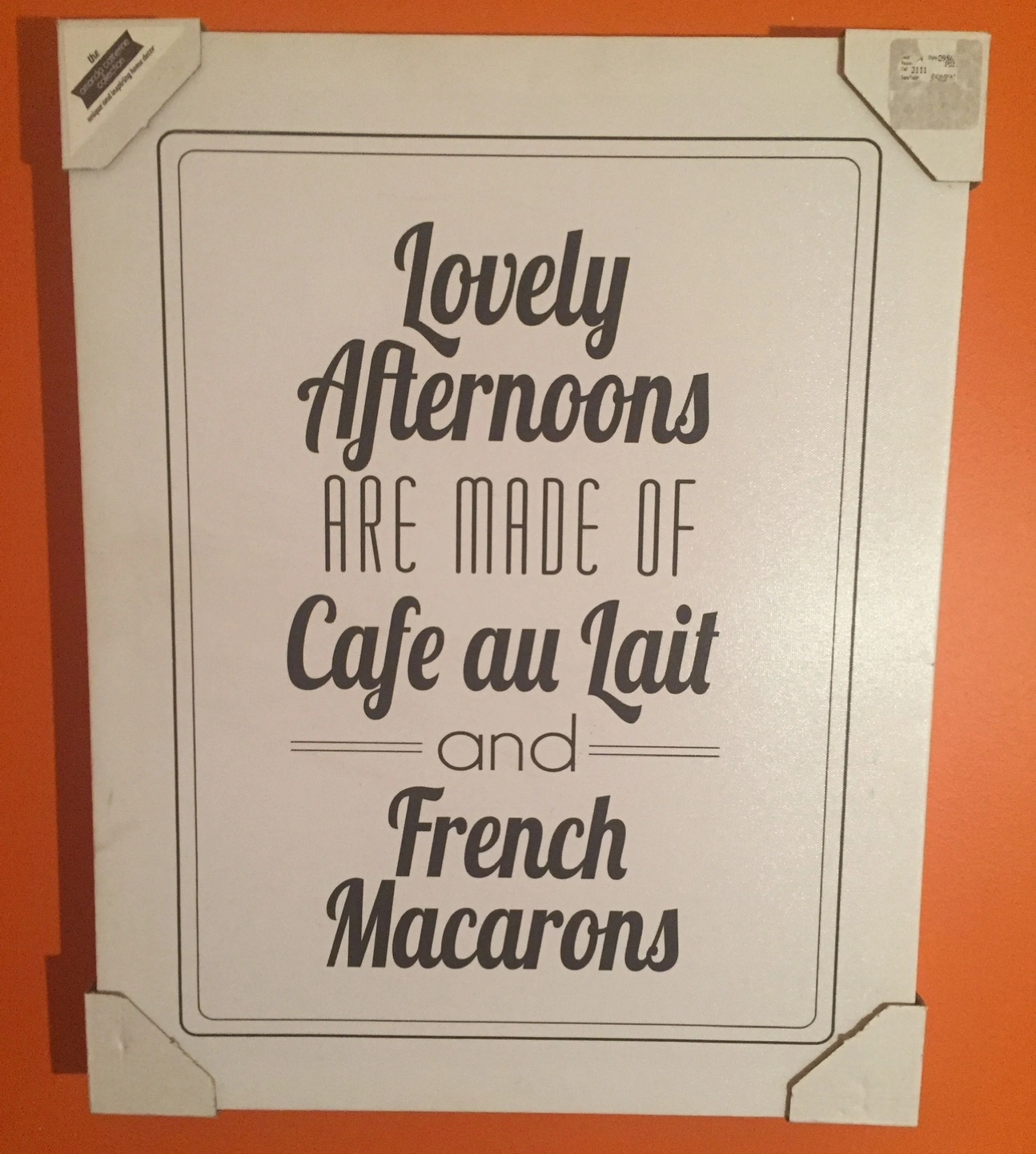 Canvas wall art with a quote about cafe au lait and macarons. White background with black lettering.
