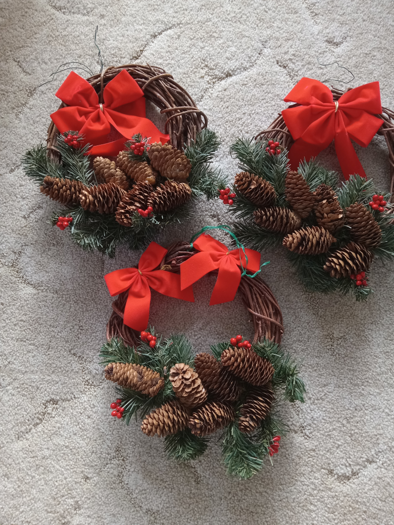 Set of 3 Christmas wreaths with pine sprigs, pine cones, and red bows. Wreaths are made of woven twigs.