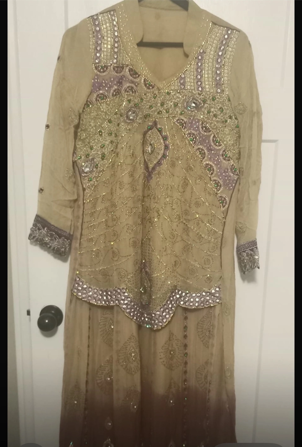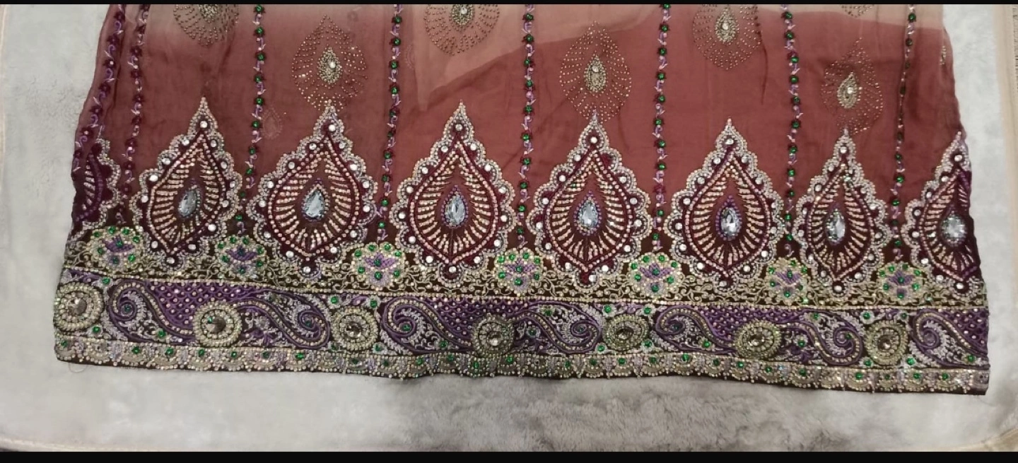 Beautiful beige and burgundy dress. Fully embroidered with rhinestones and beads. Long sleeves.
