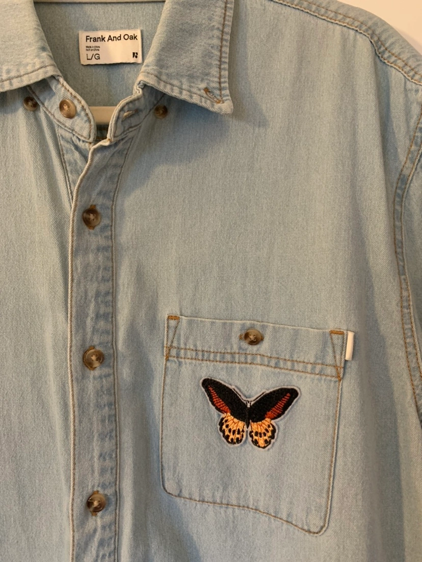 100% cotton denim shirt with embroidered pocket Like new condition, worn maybe twice Please feel free to take a look at my other listings to make bundles for a better deal! Most items are $10 or less! All sales final Serious inquiries only please Pick up only - downtown near Richmond/George