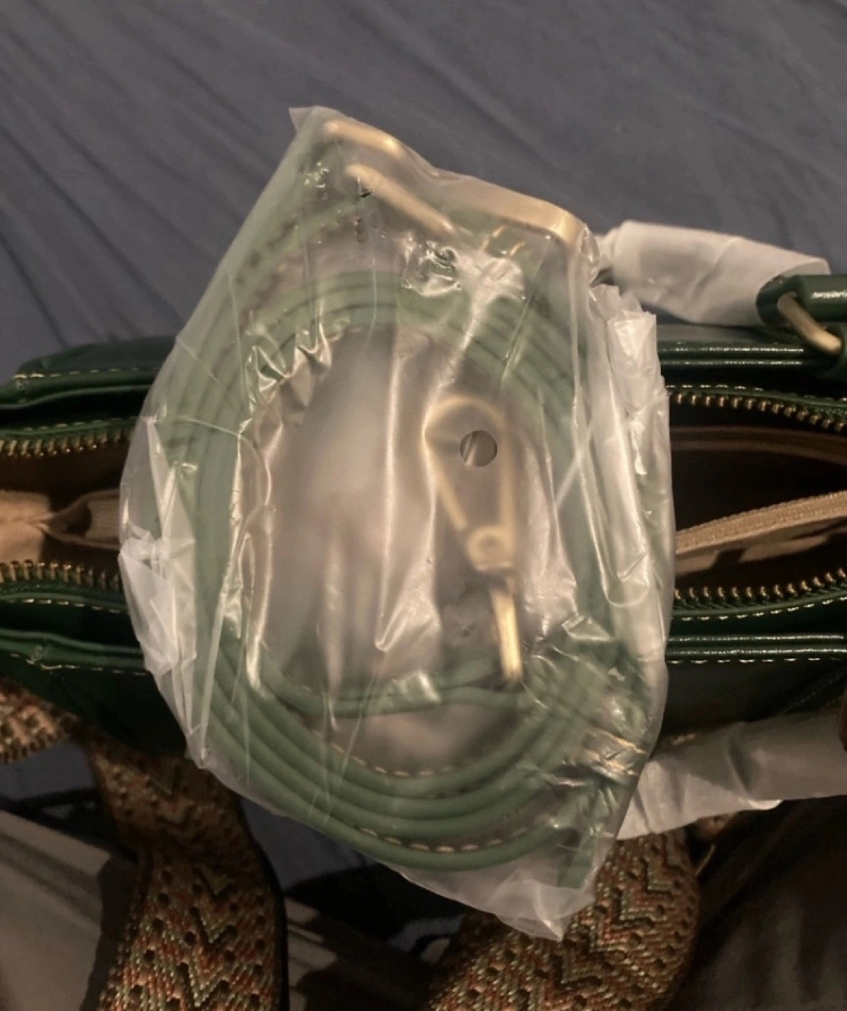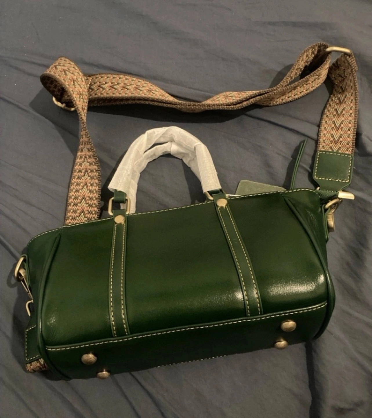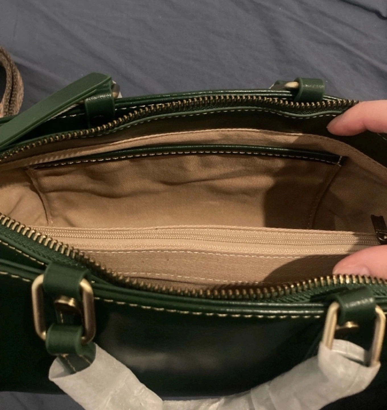388A green leather handbag with a top zipper closure, two top handles, and an adjustable and removable strap. It has an inside zippered pocket. In mint condition never worn. Size: 14 cm x 22 cm