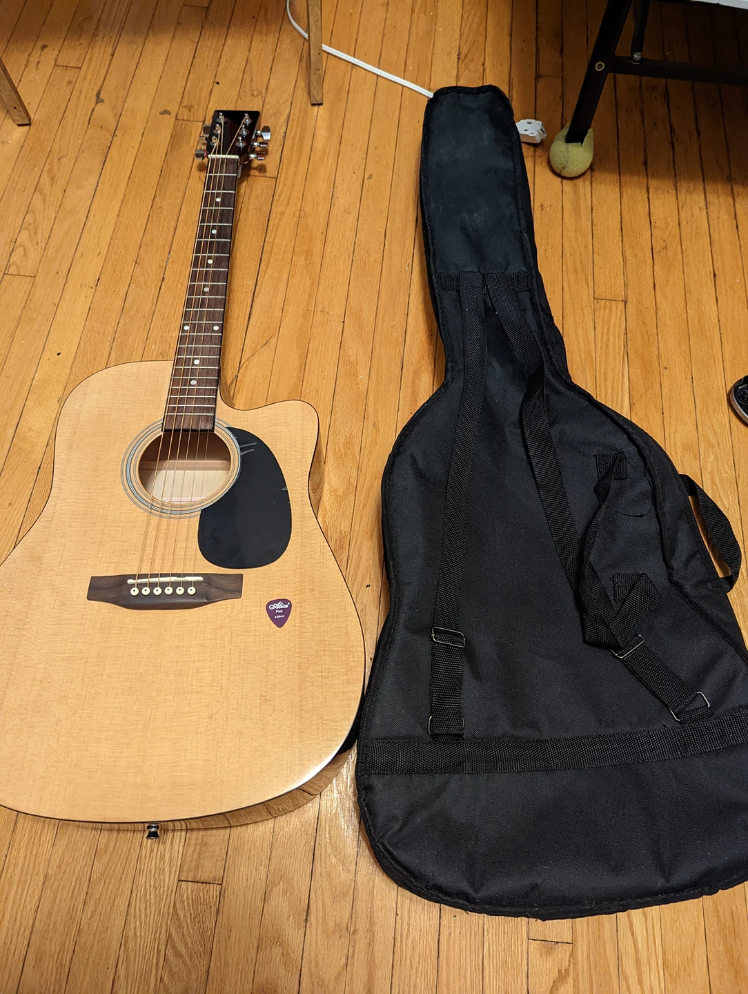 Barely used. Probably out of tune but you can use any phone tuner app for that. Comes with a bag and a pick