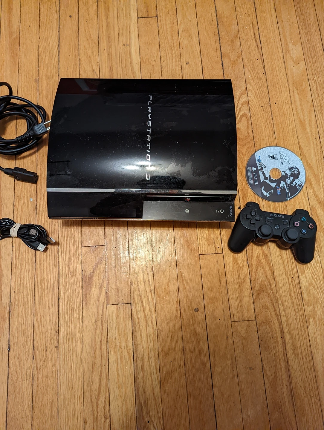 Fat PS3 with Ac Adapter, controller Charger, controller and the game: Persona 5. (No HDMI included)