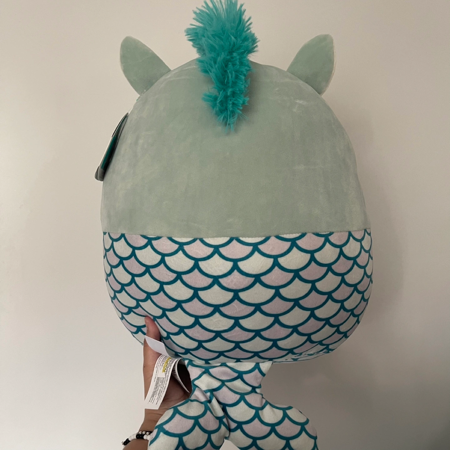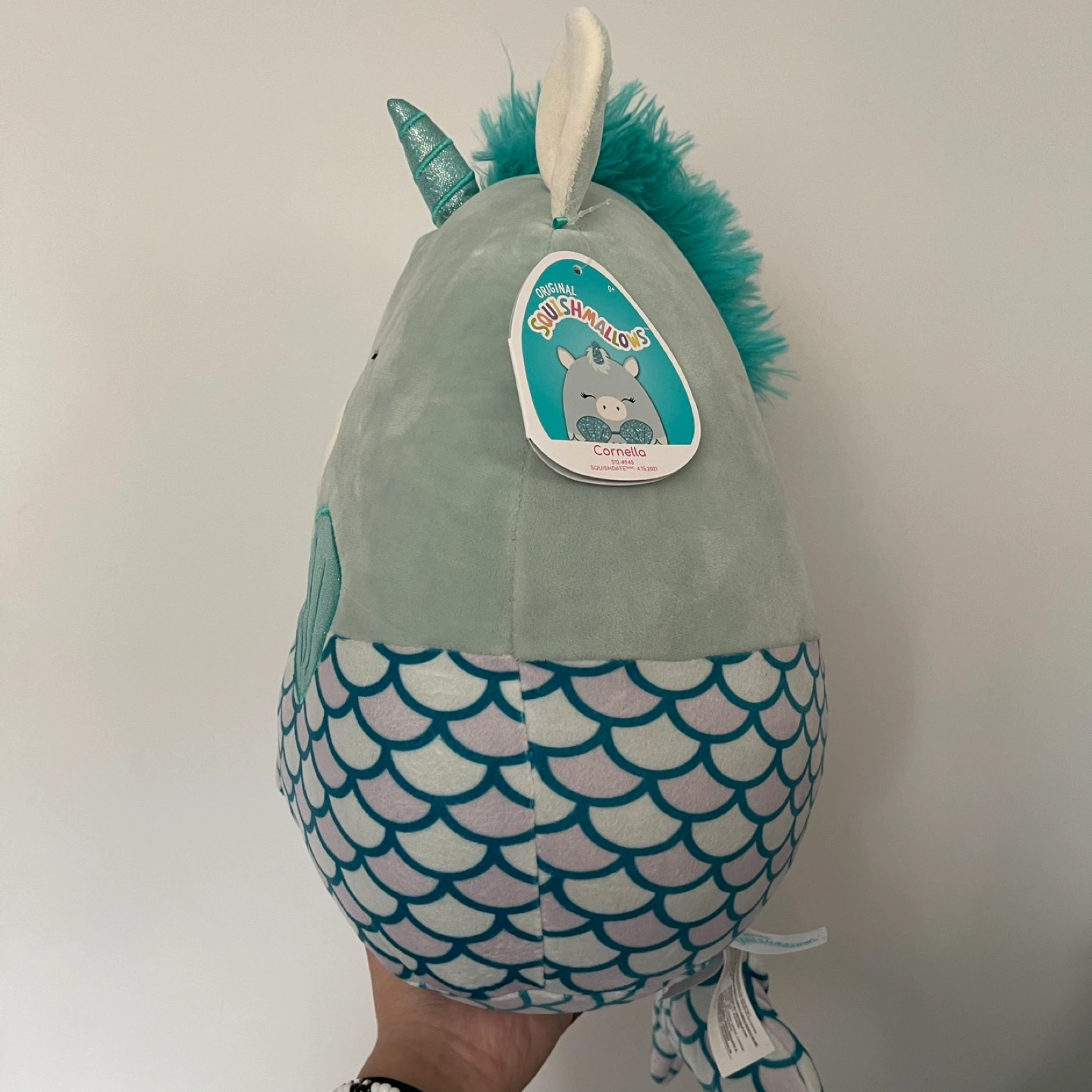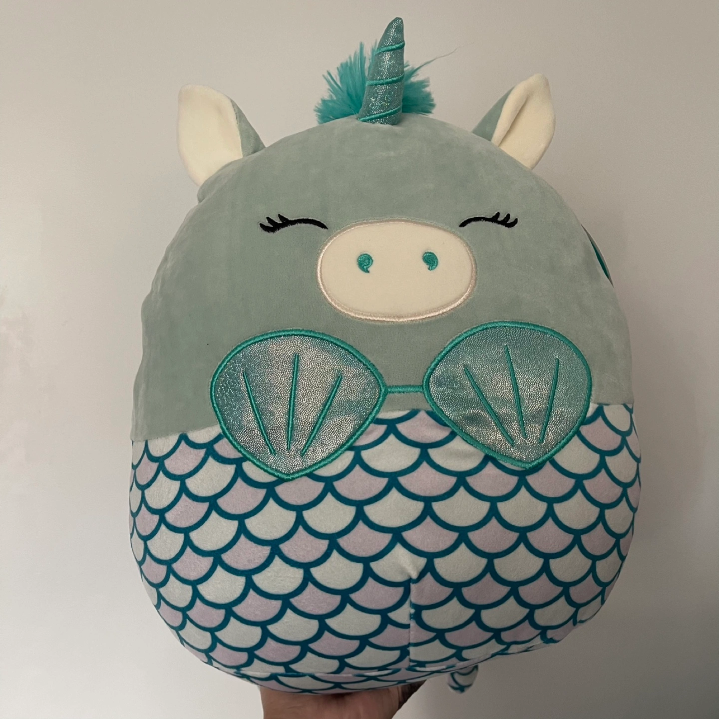 55Plush toy with a mermaid tail and unicorn horn. Green with a light purple and teal scale pattern.