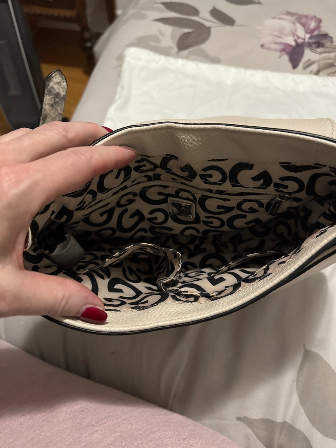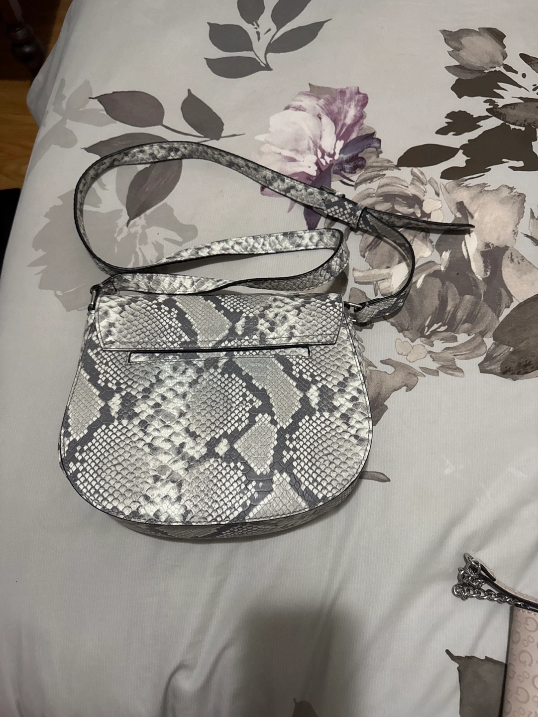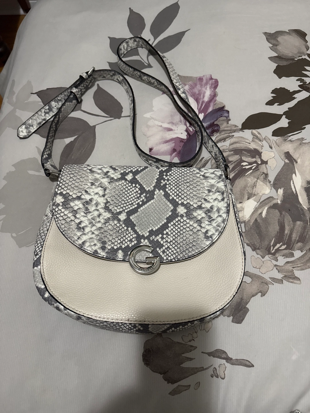 White and grey snakeskin crossbody bag with a silver Guess logo. Has a 4 inside pockets and one back pocket and one front pocket.