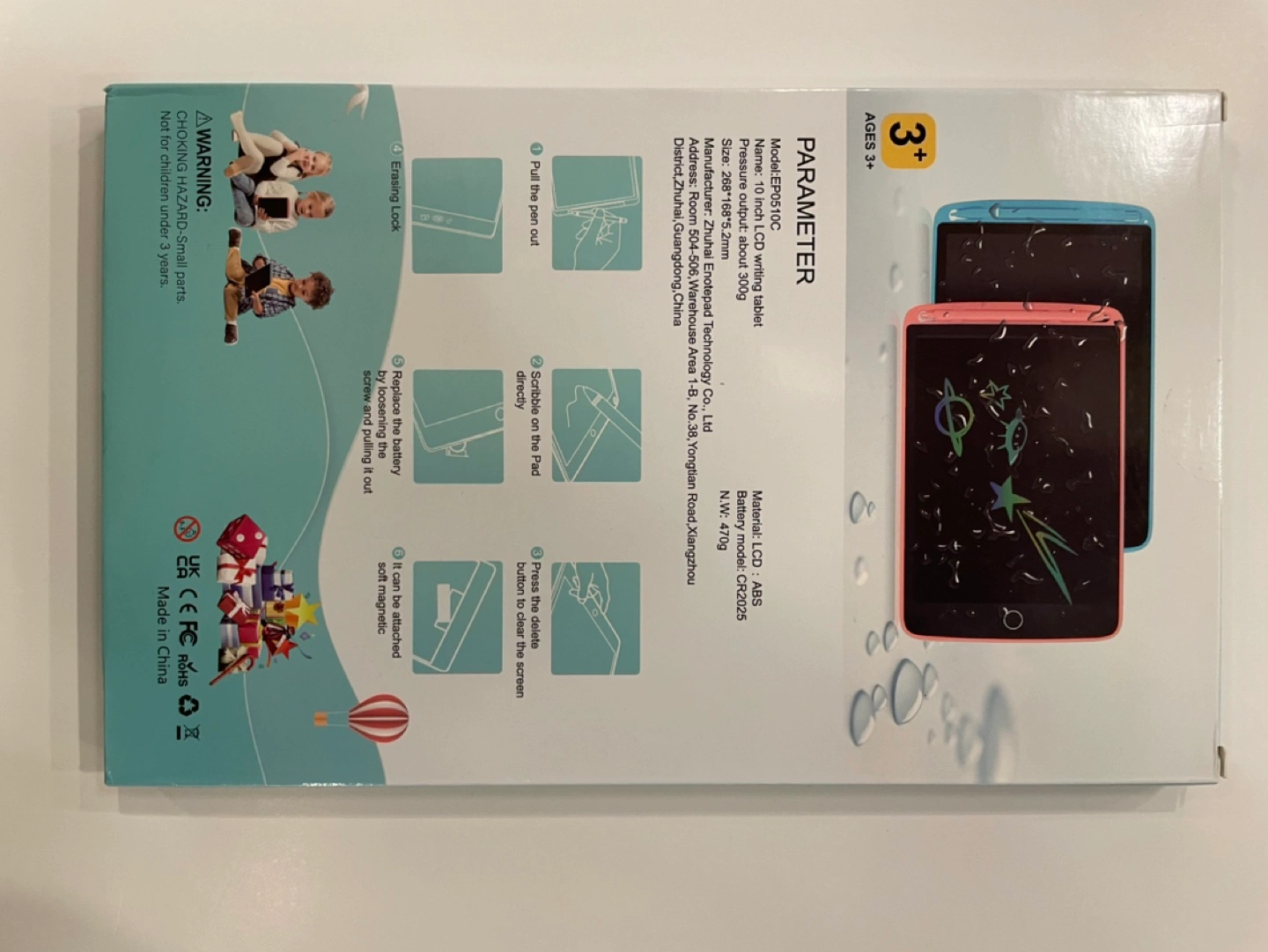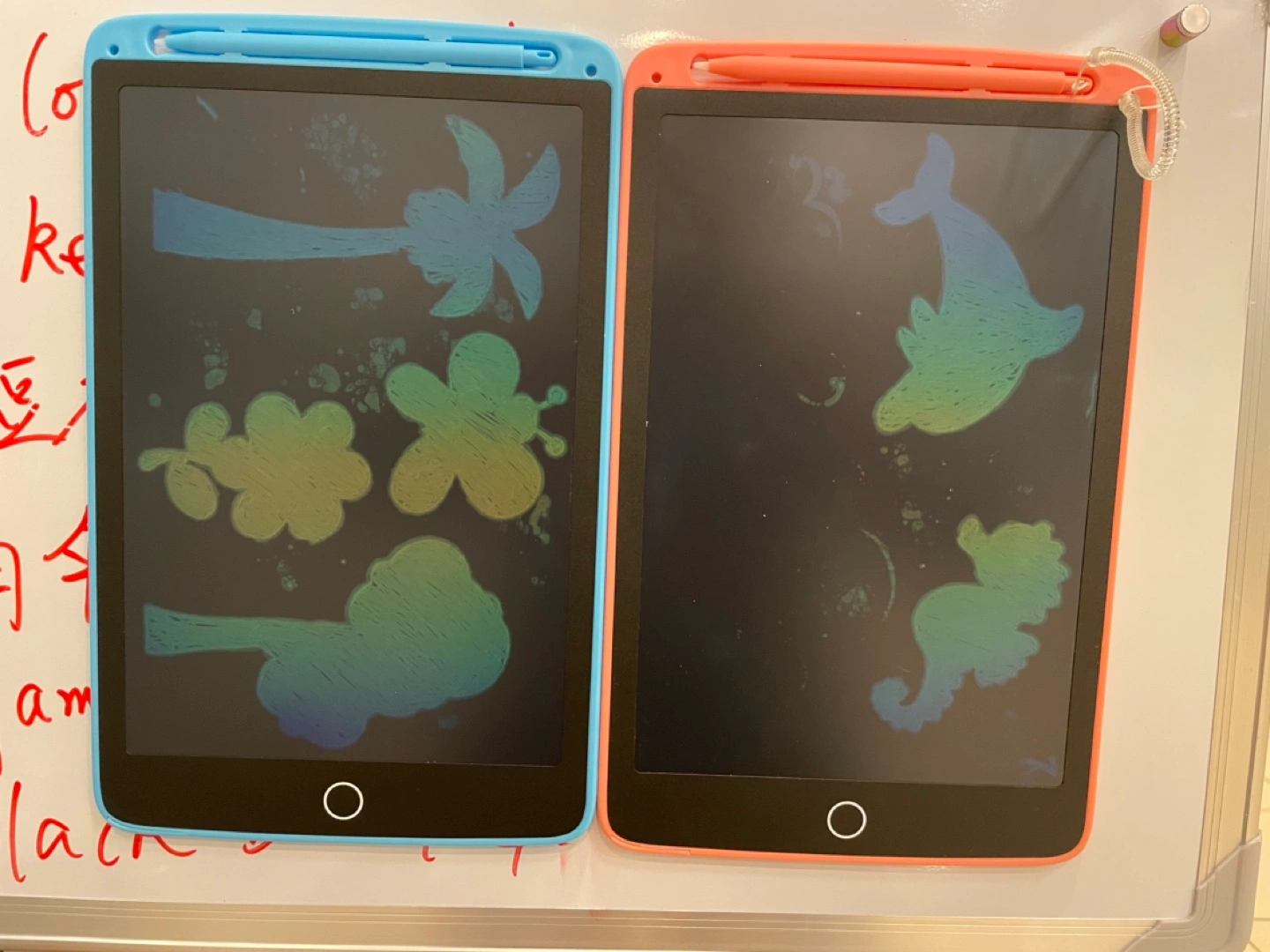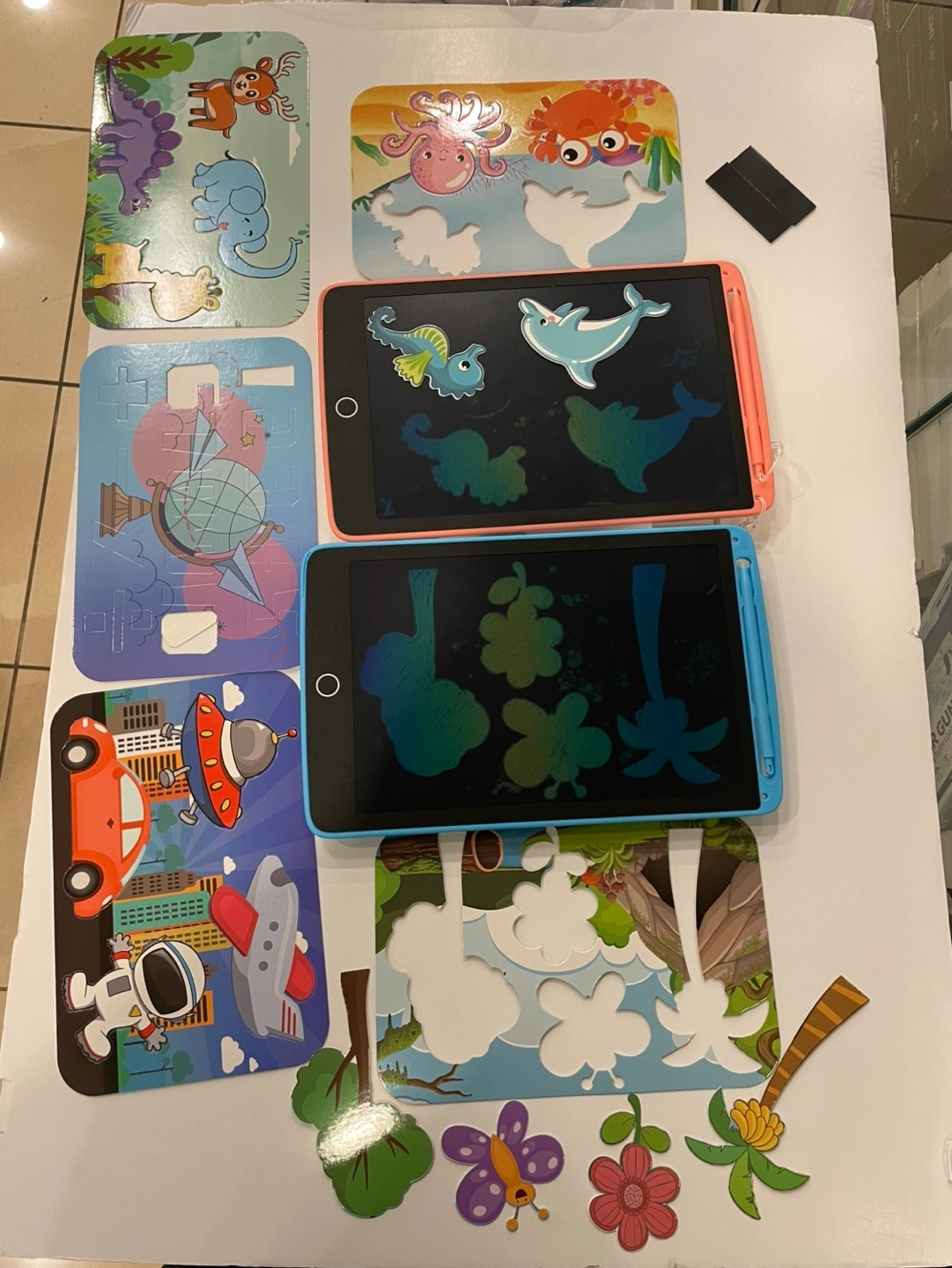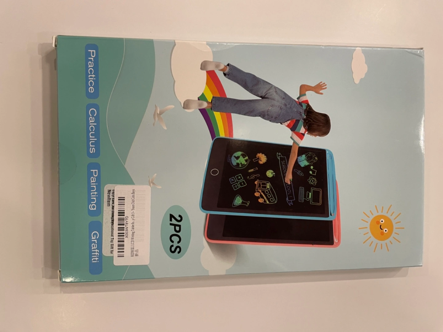 2 pack of 10 inch LCD writing tablets. Includes 2 stylus and comes with a lock to prevent accidental erasing. 5 copy cards