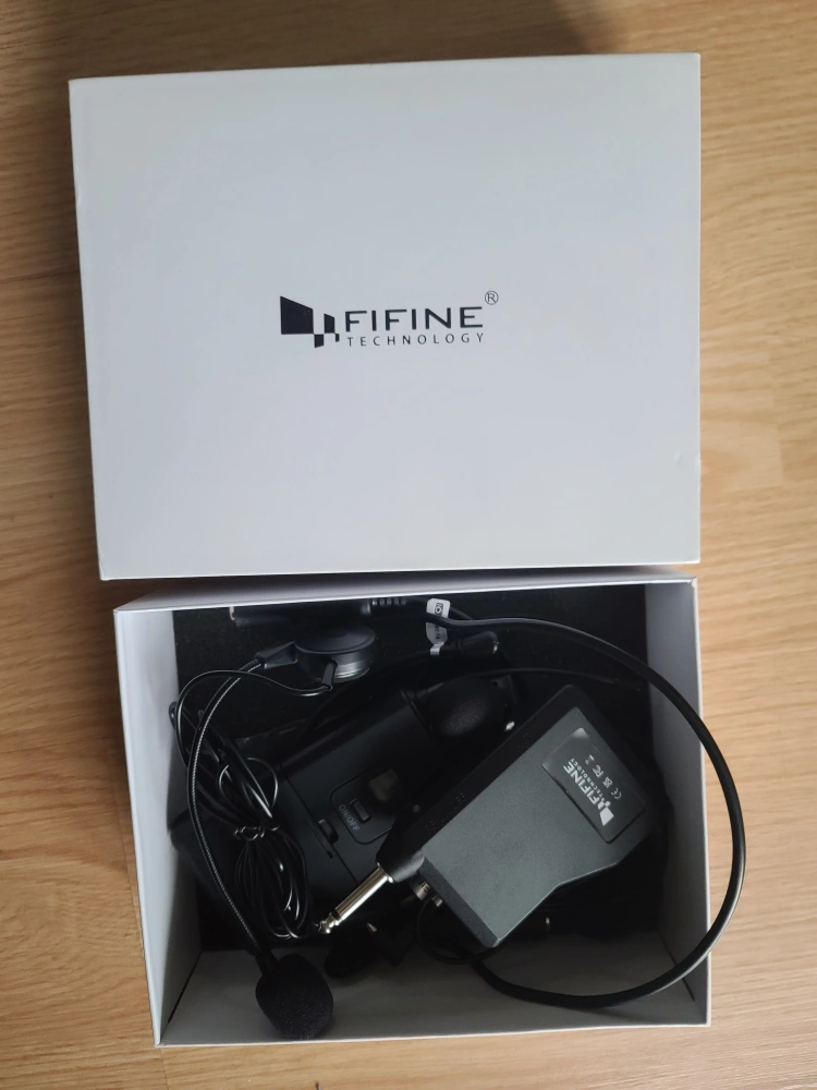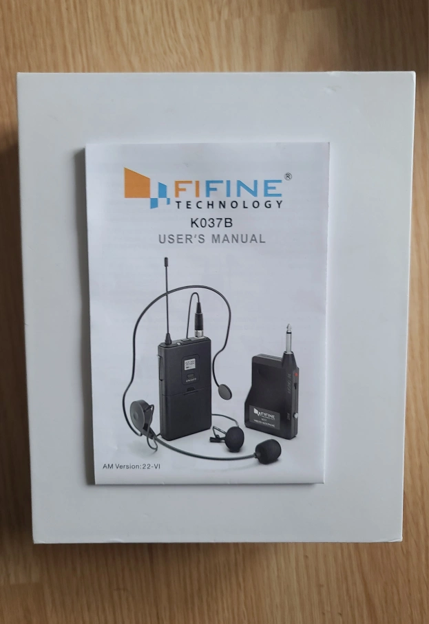 Wireless lavalier microphone with transmitter and receiver, comes with user manual and box.