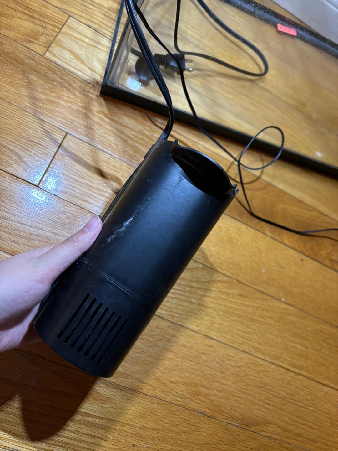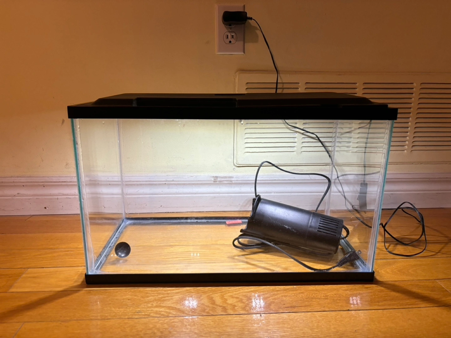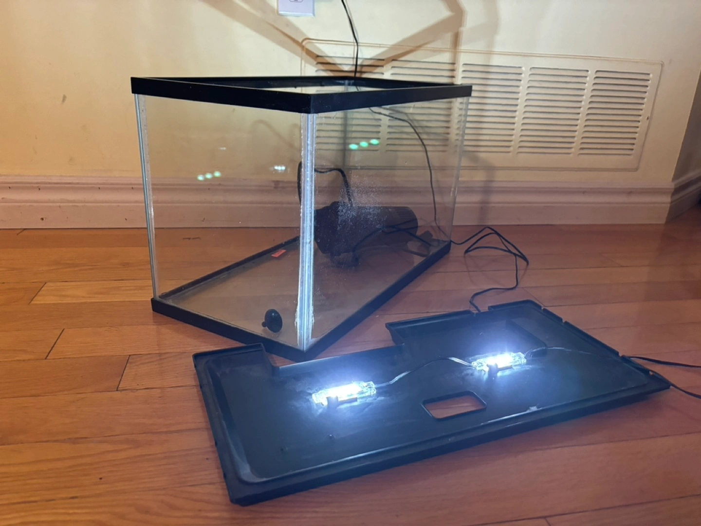 Old aquarium with filter and light. Includes the black hood with small LED lights, and