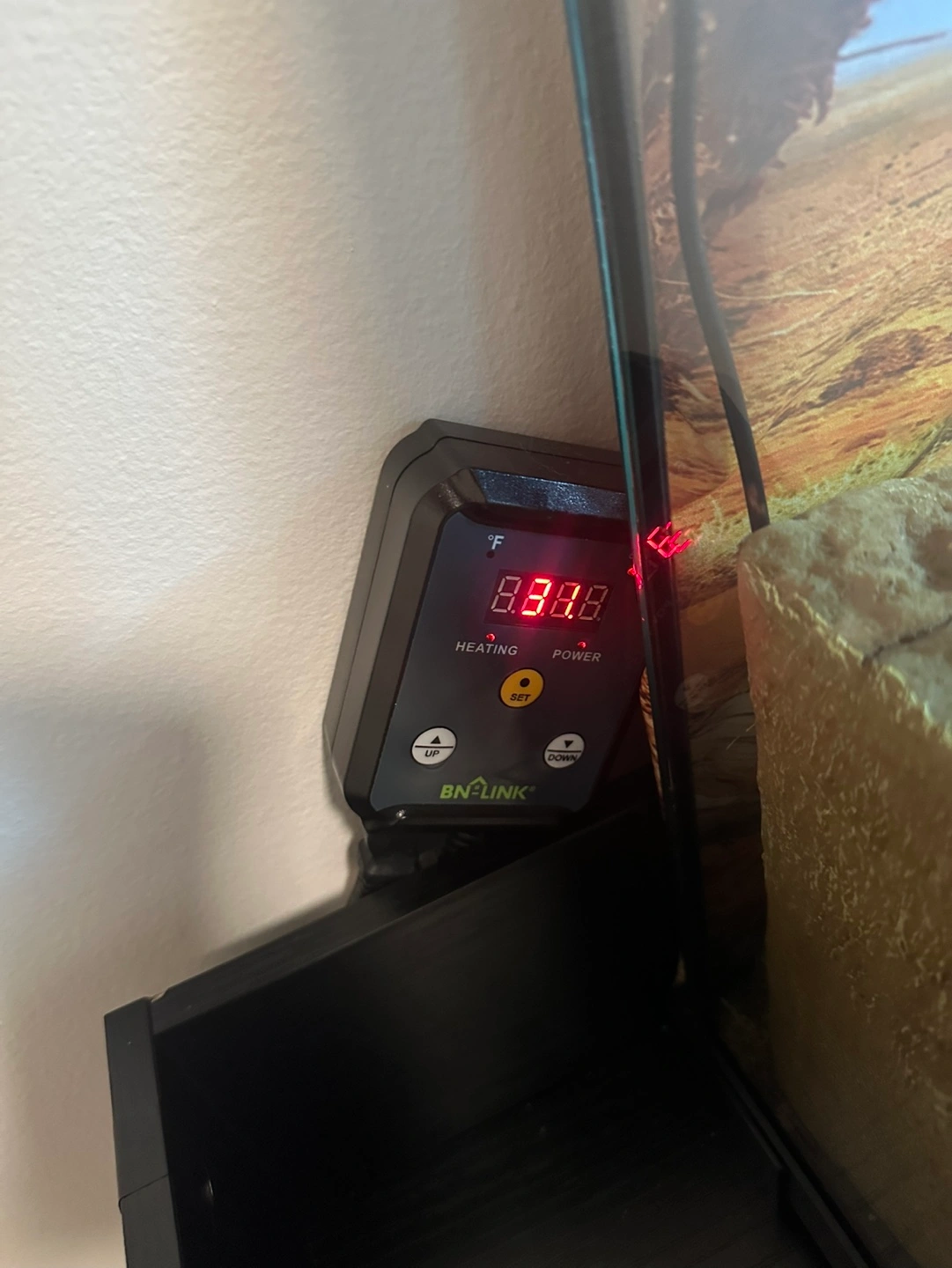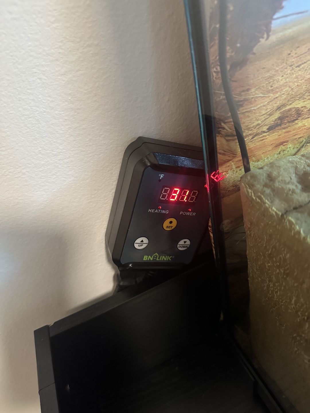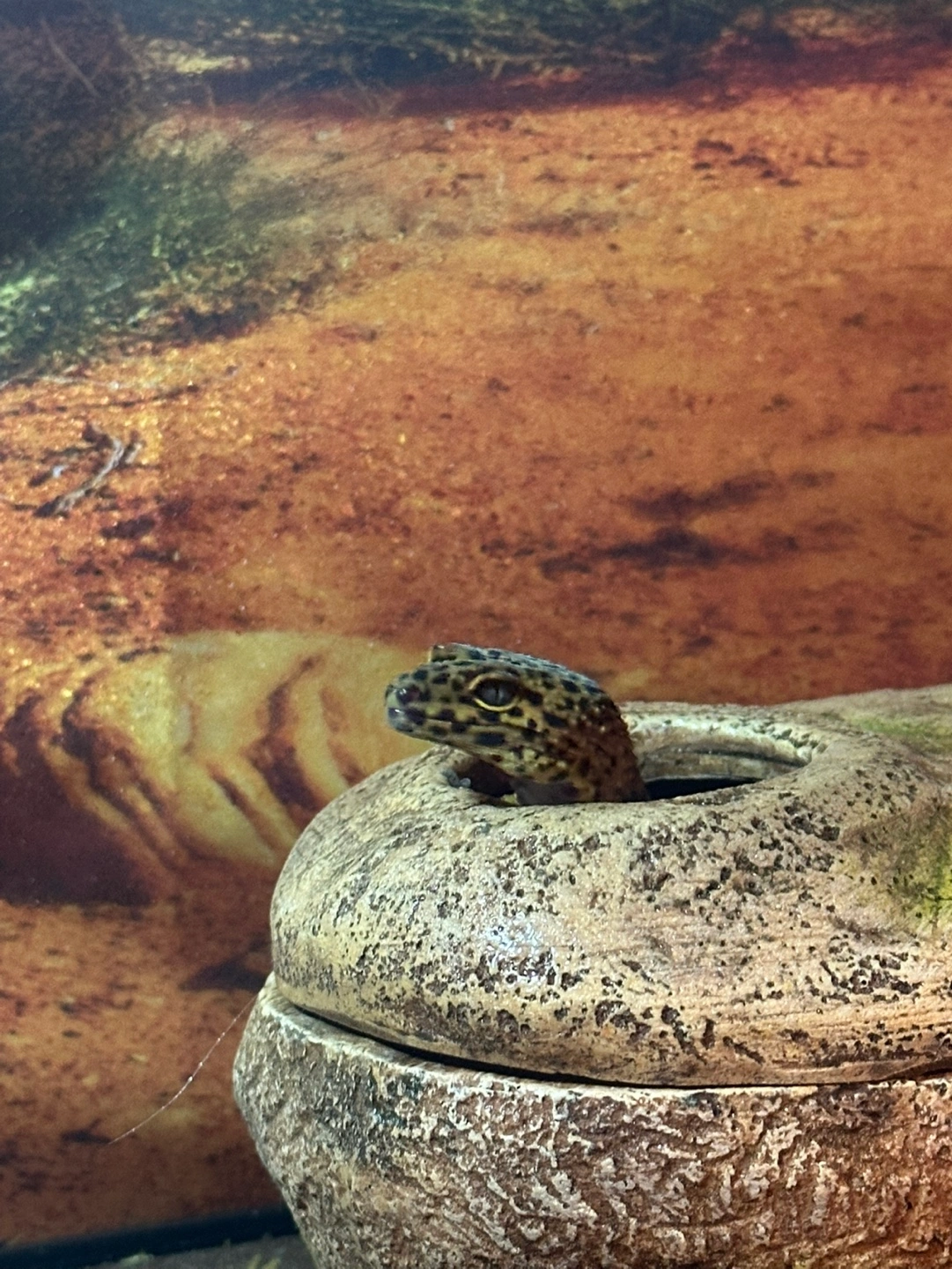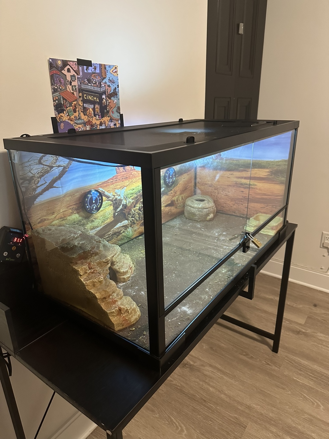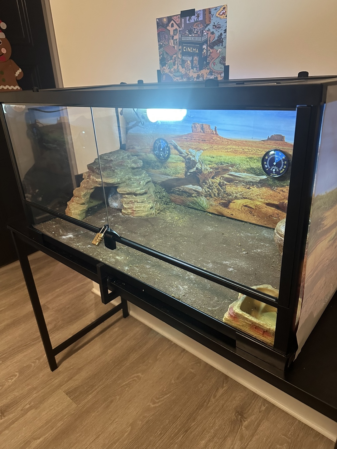 Leopard geco, 40 gallon glass reptile tank with a built-in lock. Includes heat lamp, thermometer, thermostat, thermal pad and decoration. Comes with desert-themed background and substrate.