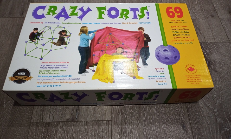 Construction toy can be made into several styles of fort. All 25 purple balls and 44 green sticks are present with instructions.