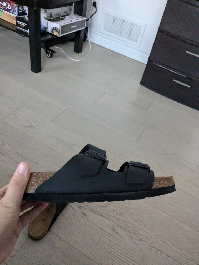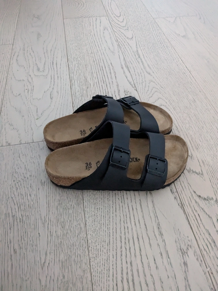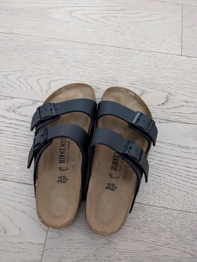 Black leather Birkenstock Arizona sandals in size 36. Made in Germany. Have the original receipt. Free delivery in Pickering, Scarborough.