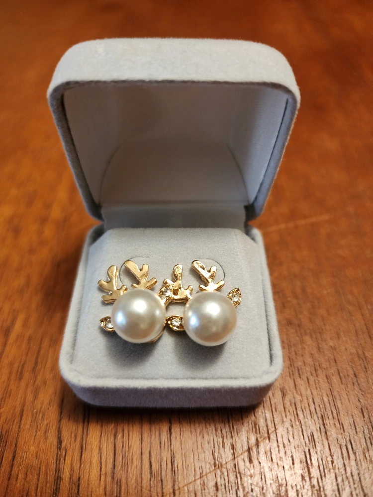 Gold tone reindeer earrings with faux pearl accents. Comes in a small grey box, perfect for gifting. Never worn.