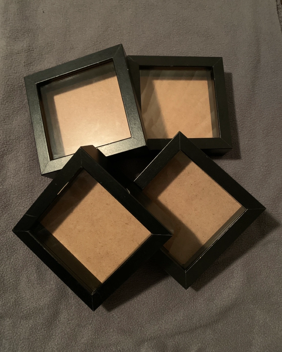 Set of four black IKEA picture frames. They have some small scratches, but could be touched up, have decorative touches added, or be repainted.