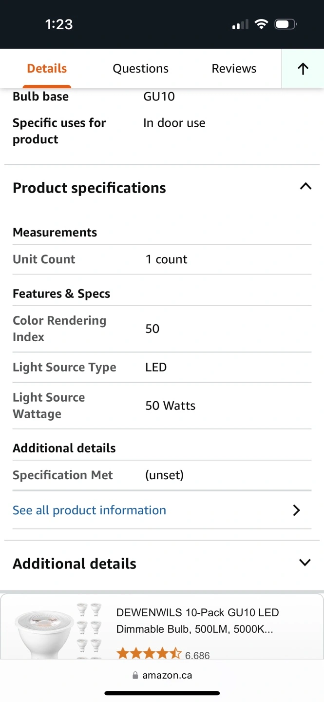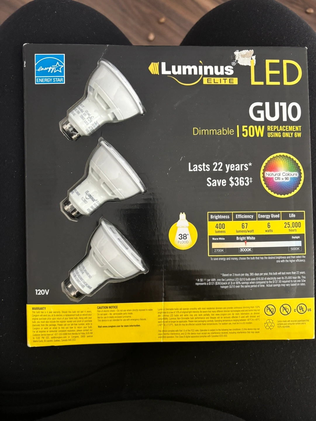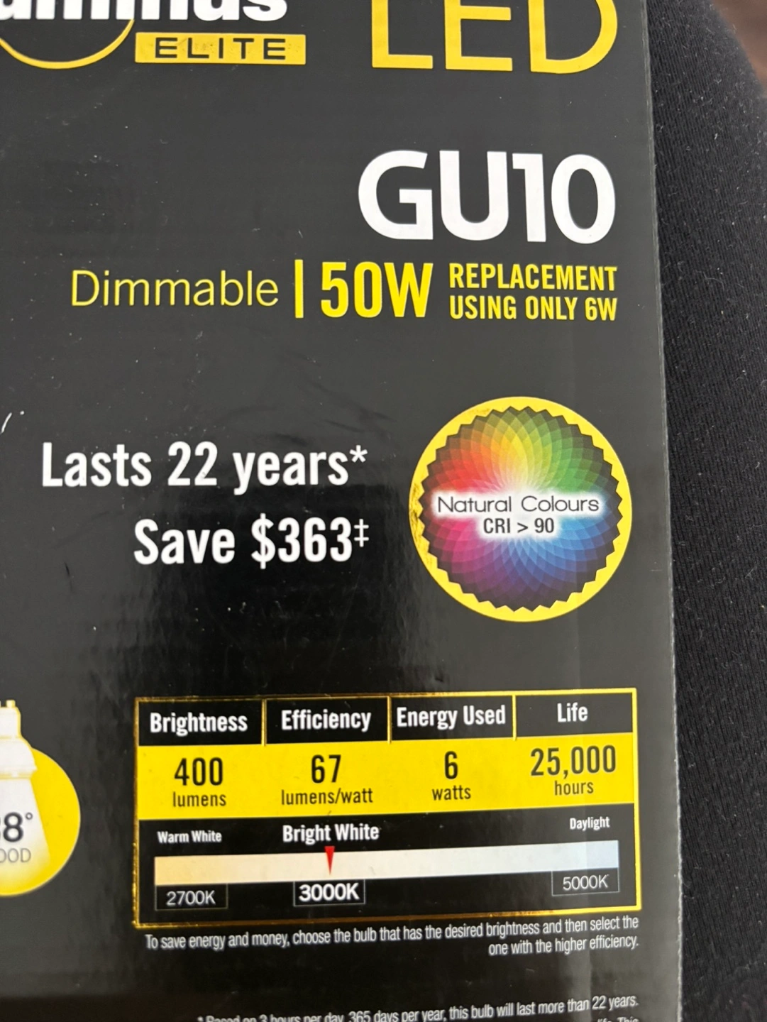 Dimmable LED bulbs with a GU10 base. Energy efficient, lasts 22 years, save $363. Package contains 3 bulbs.