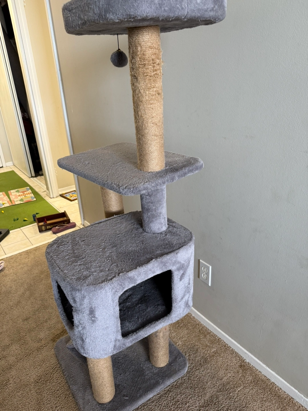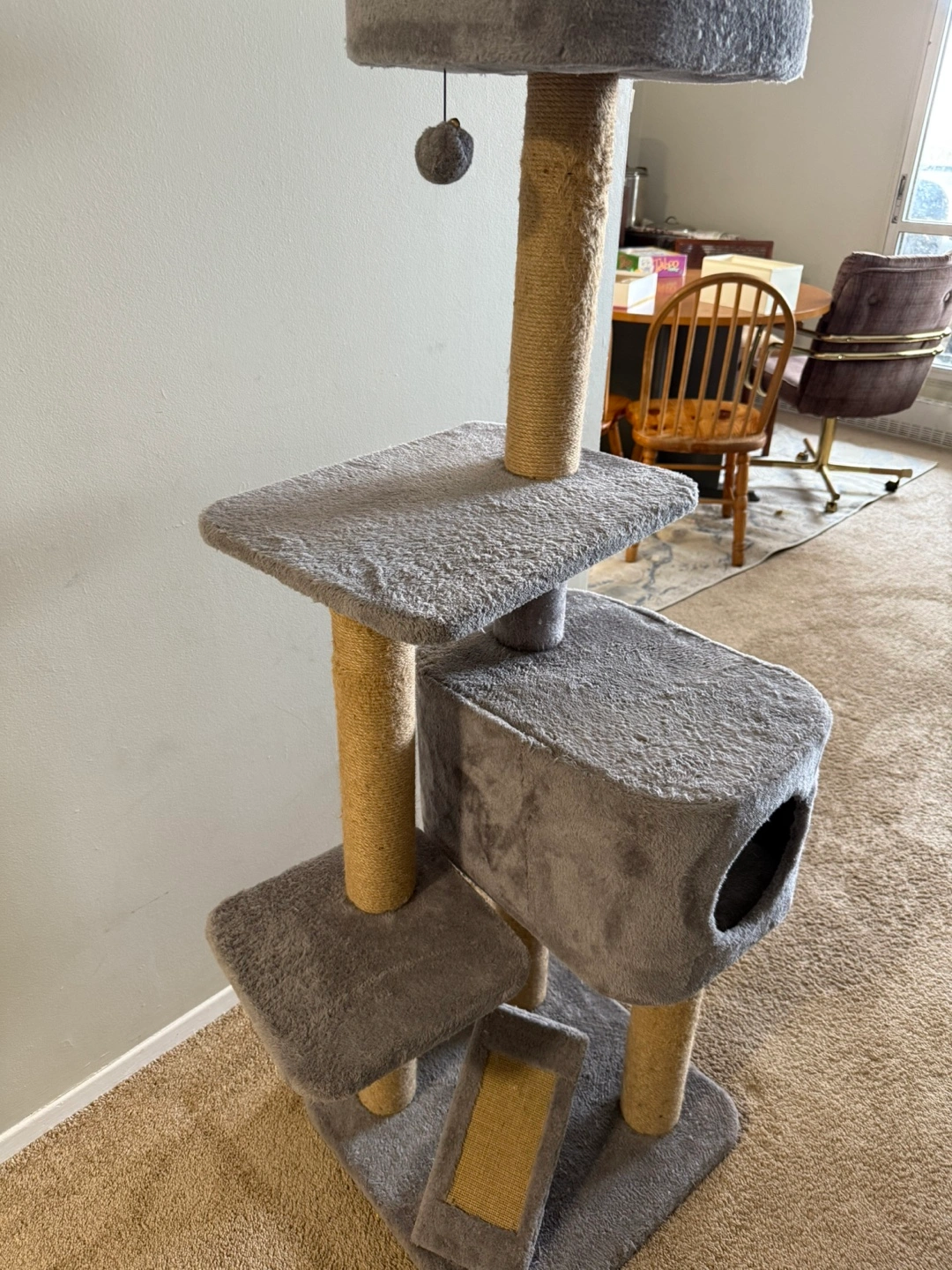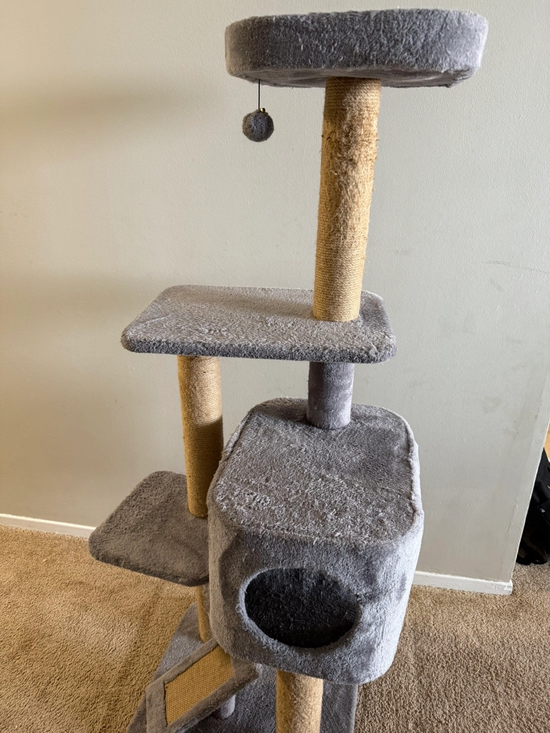 Cat tree with scratching posts, multiple platforms, and a condo. Grey and beige colour.
