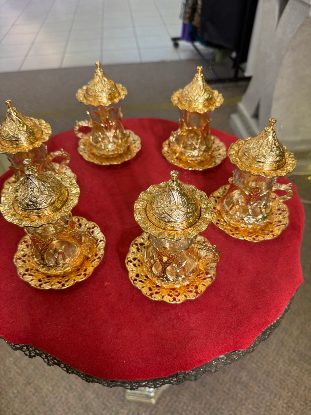 Gold coloured teacups, saucers and lids. Beautiful intricate designs.