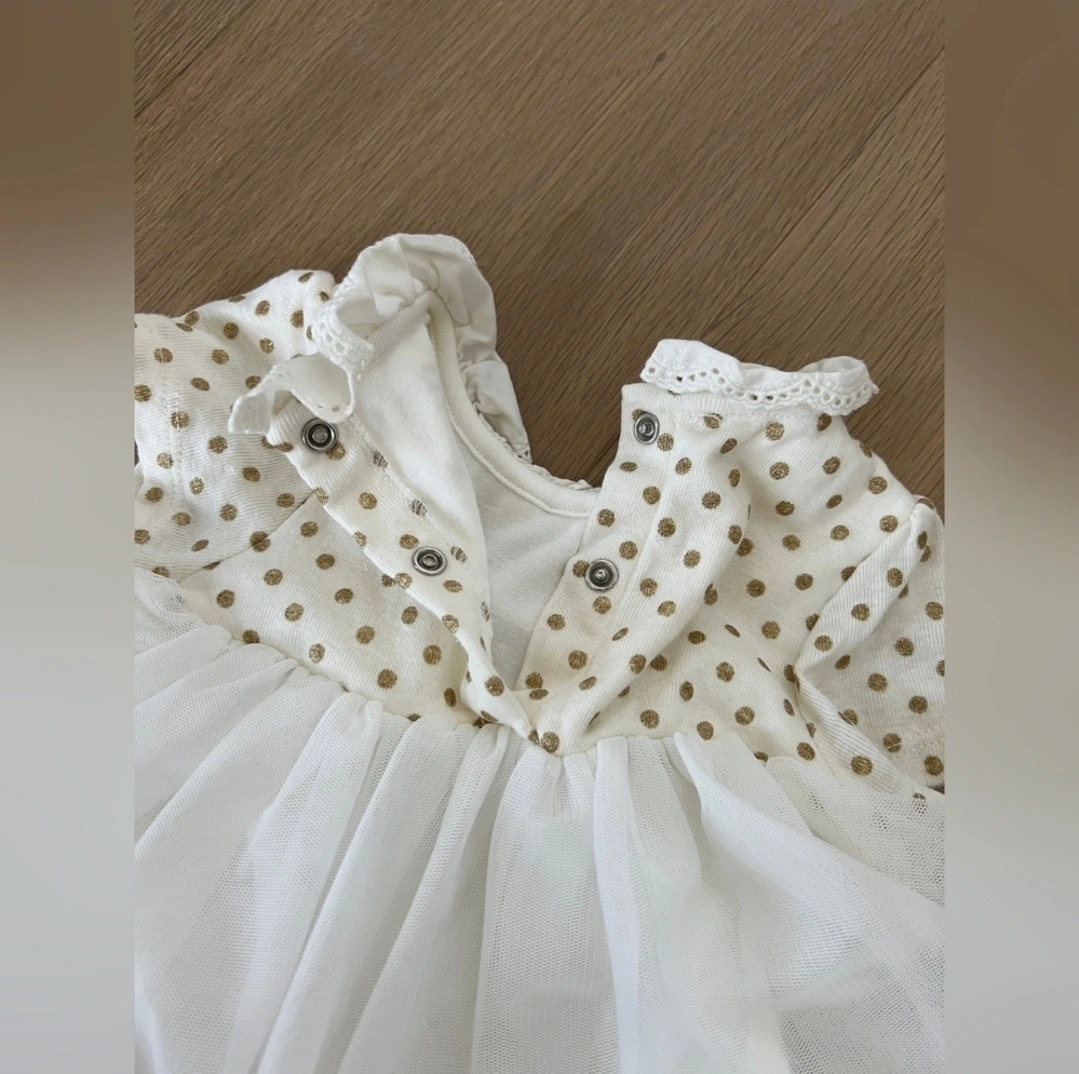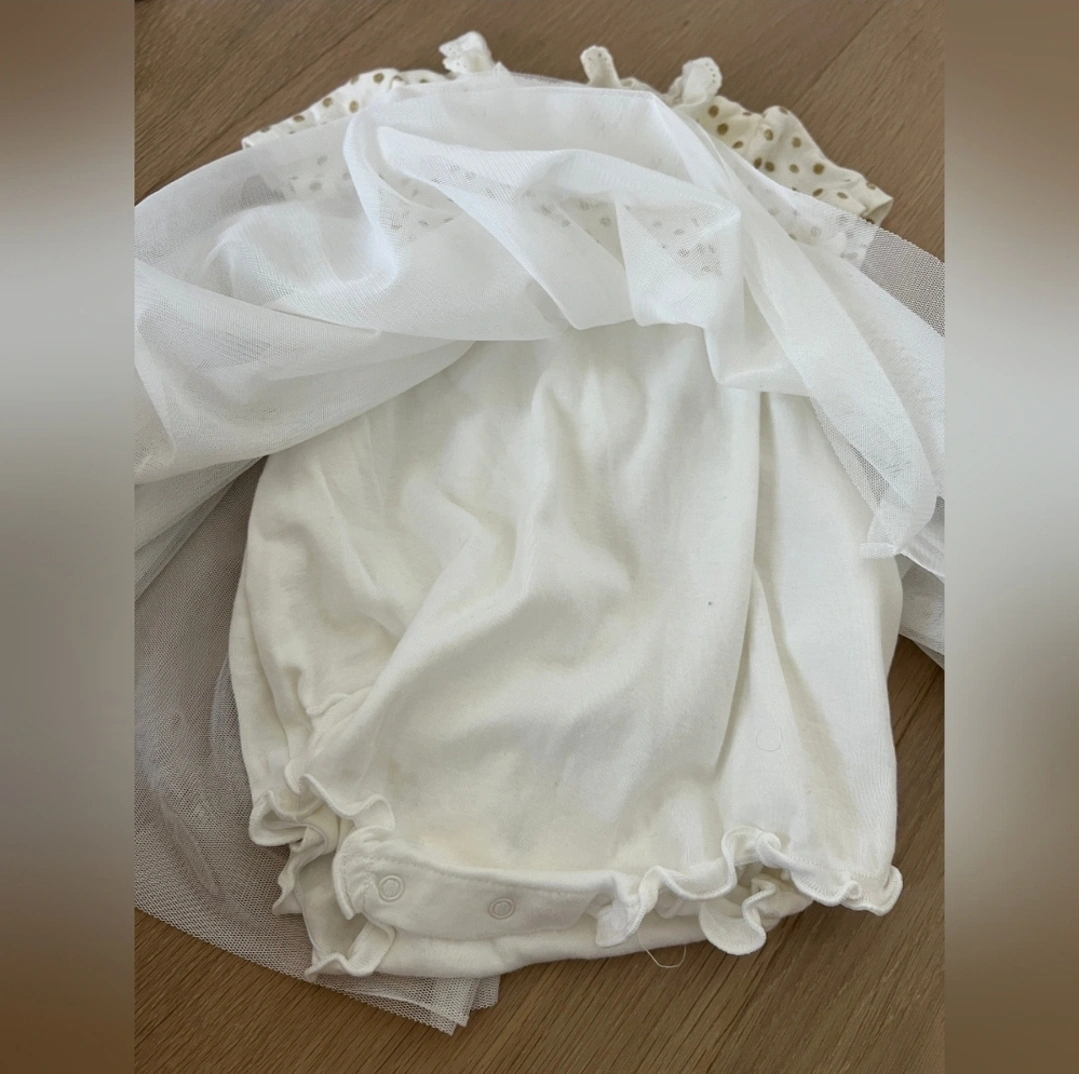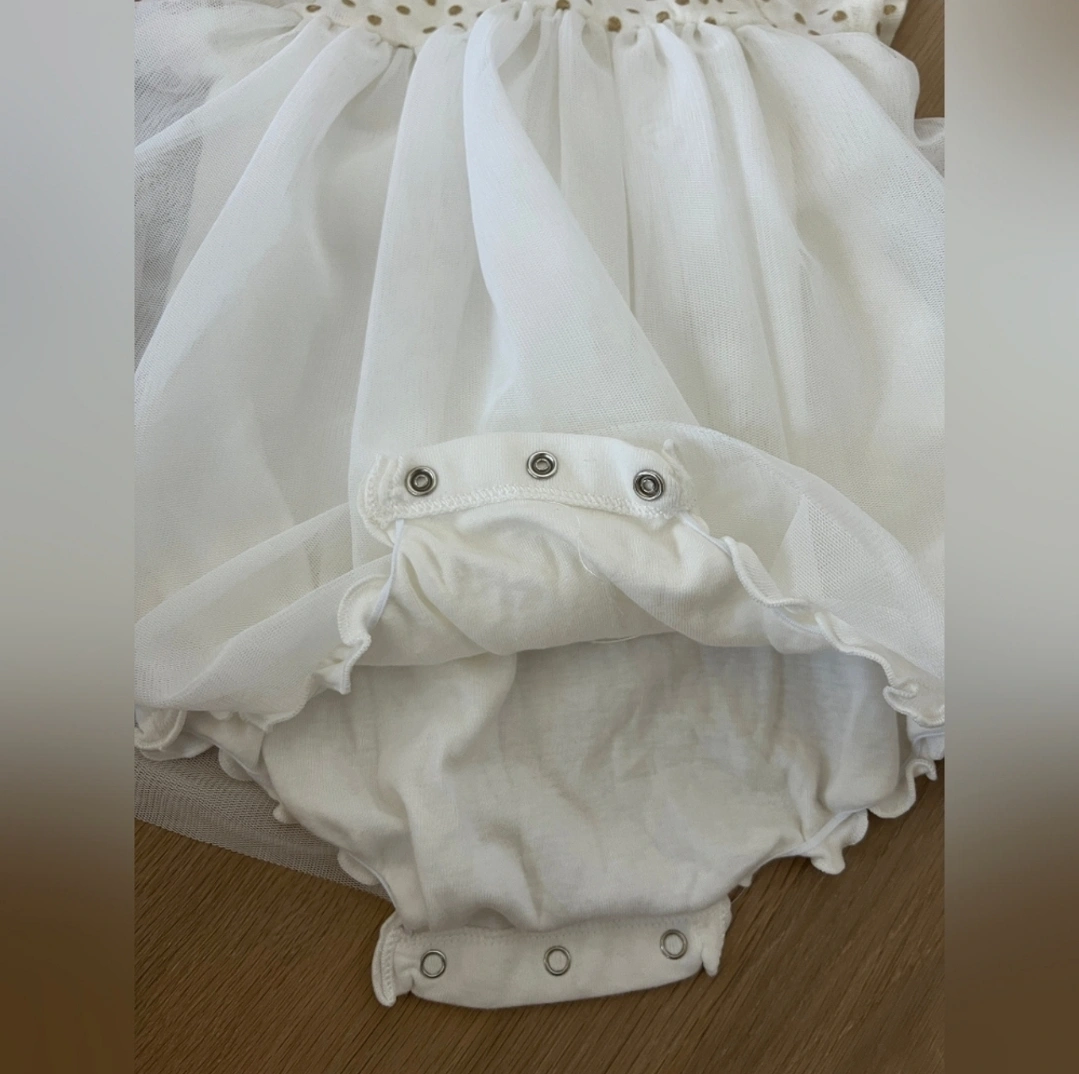 Skirt consists of two layers of plain tulle. Poppers on the back and between the legs