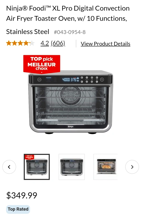 Ninja Foodi 10-in-1 XL Pro Air Fry Digital Countertop Convection Toaster Oven with Dehydrate and Reheat, 1800 Watts, stainless steel. This convenient air oven features a pair of interior racks that don’t require you to rotate food while cooking. With 10 cooking functions to suit a variety of needs, this reliable, durable air oven is a must-have in any kitchen. MSRP $390+ tax, selling for $150