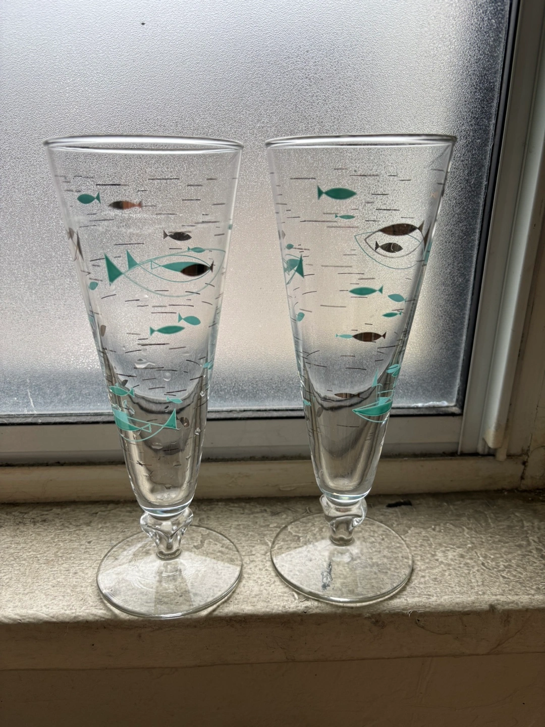 Set of two vintage beer glasses with a fish design. They are clear glass with a teal and black design.