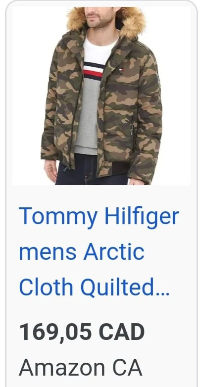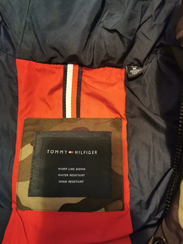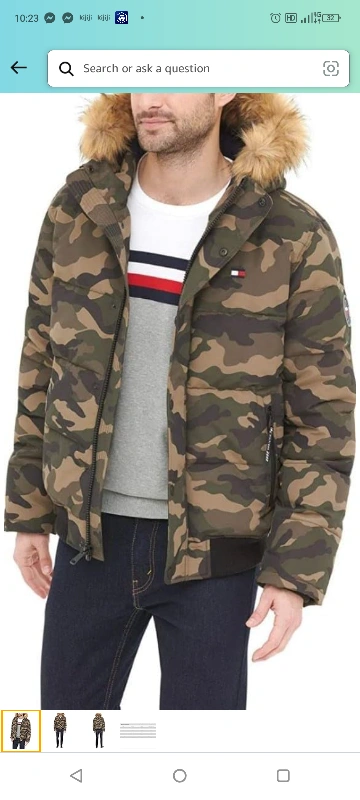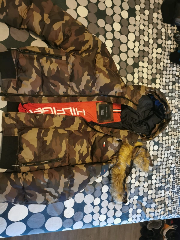 Camouflage print bomber jacket with fur-lined hood. Warm, water and wind resistant.