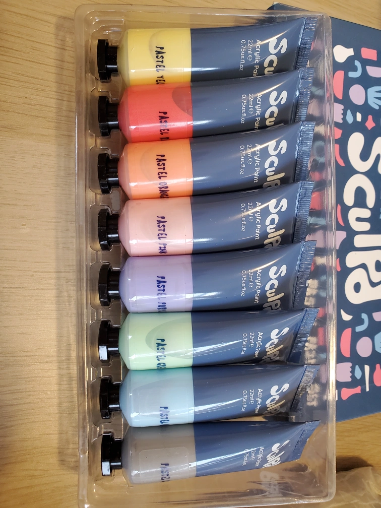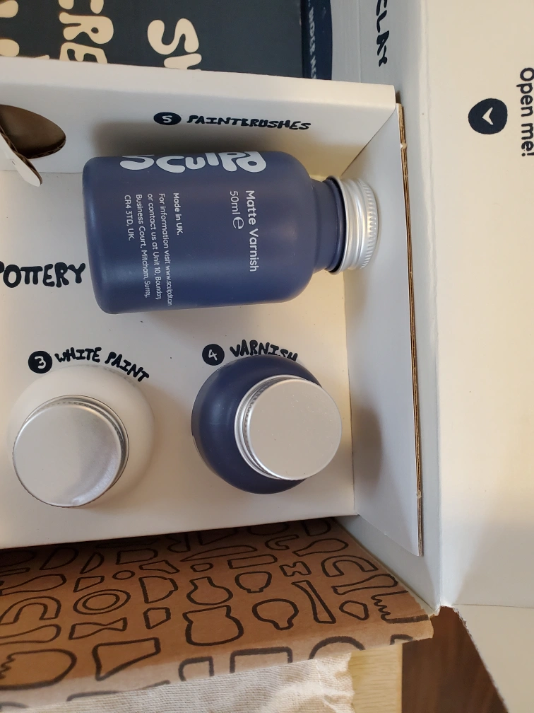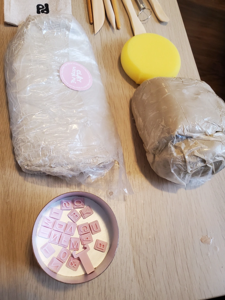 Clay/pottery set for crafts at home, used once. Includes two lumps of clay, sculpting tools, a couple brushes, sponge paints and varnishes, and select letters for imprinting. The clay is quite dry, but perhaps can be revived with some water.