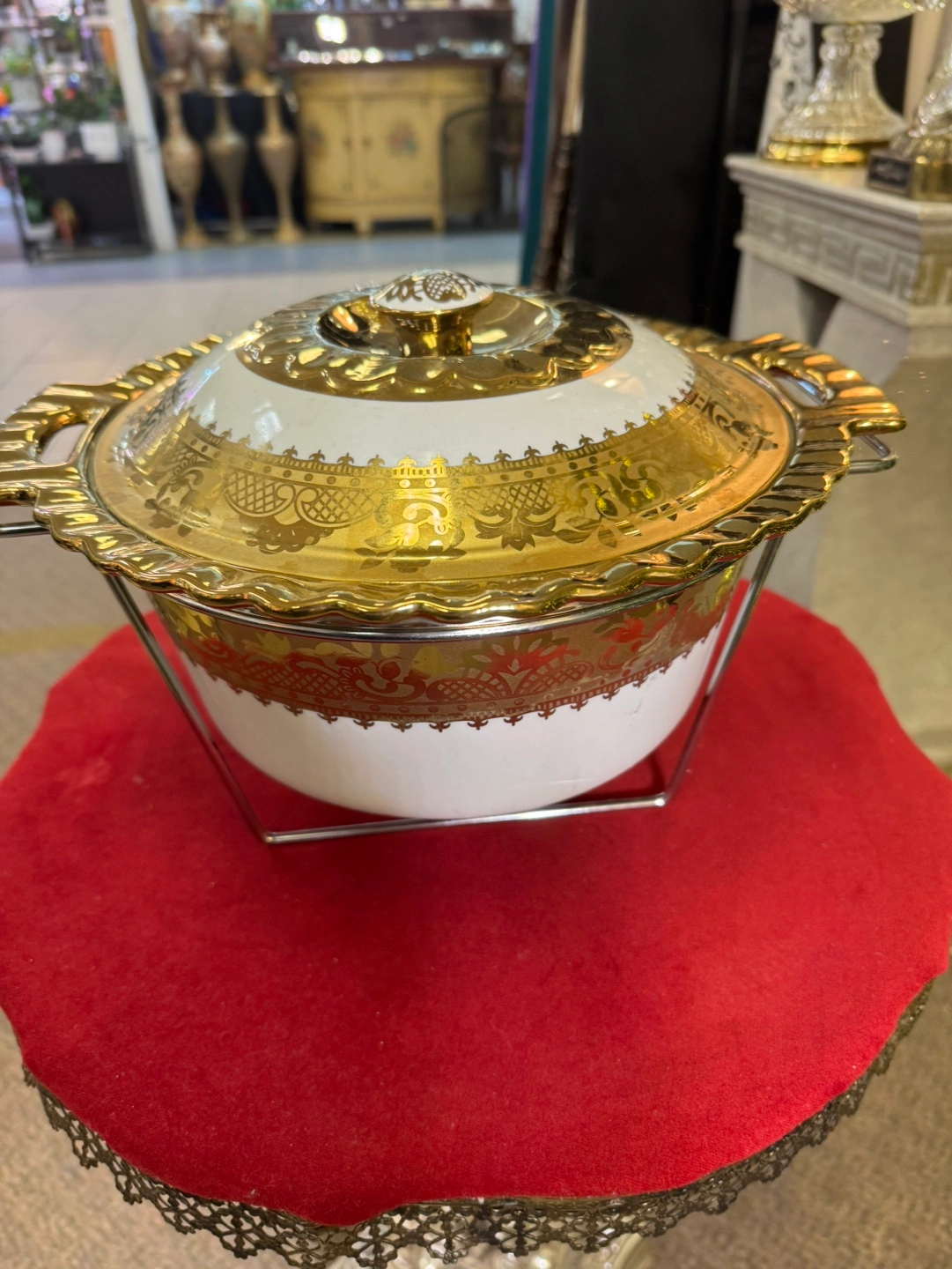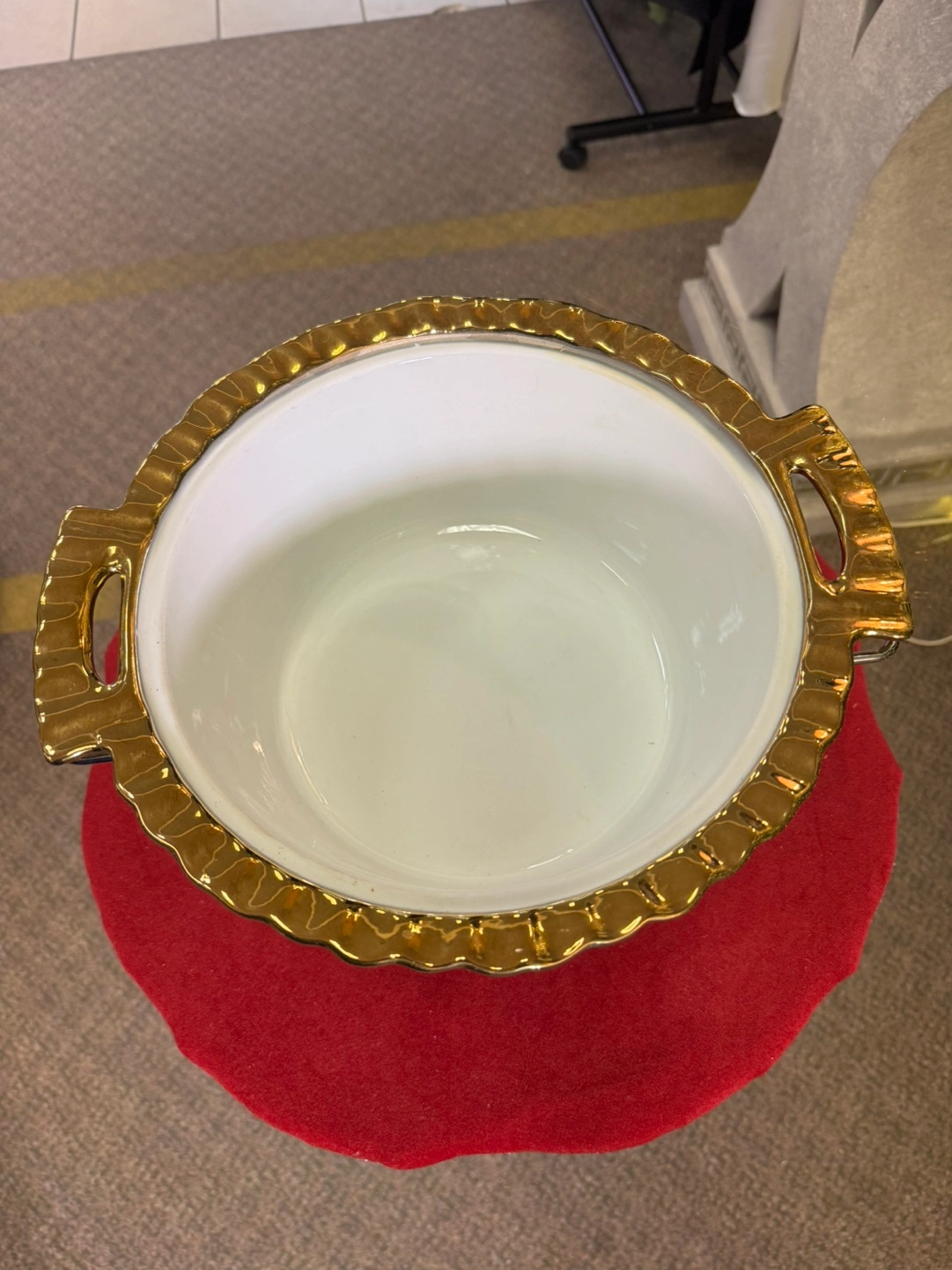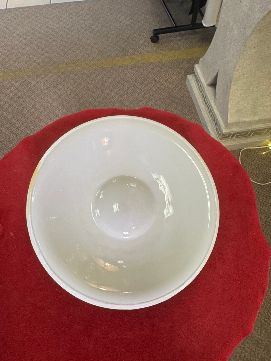 White ceramic serving bowl with gold accents. Includes a stand.Diameter 11.5 inch