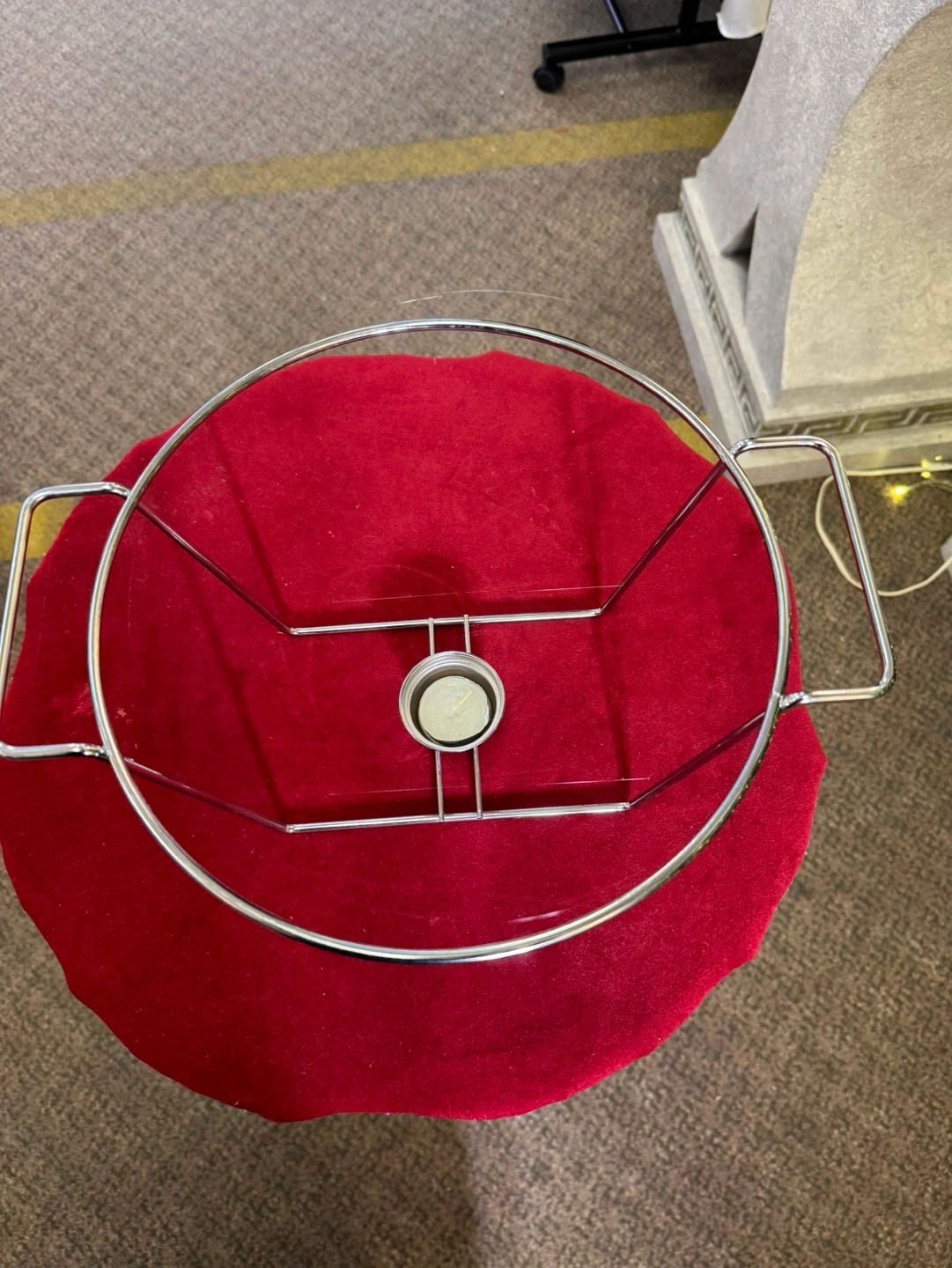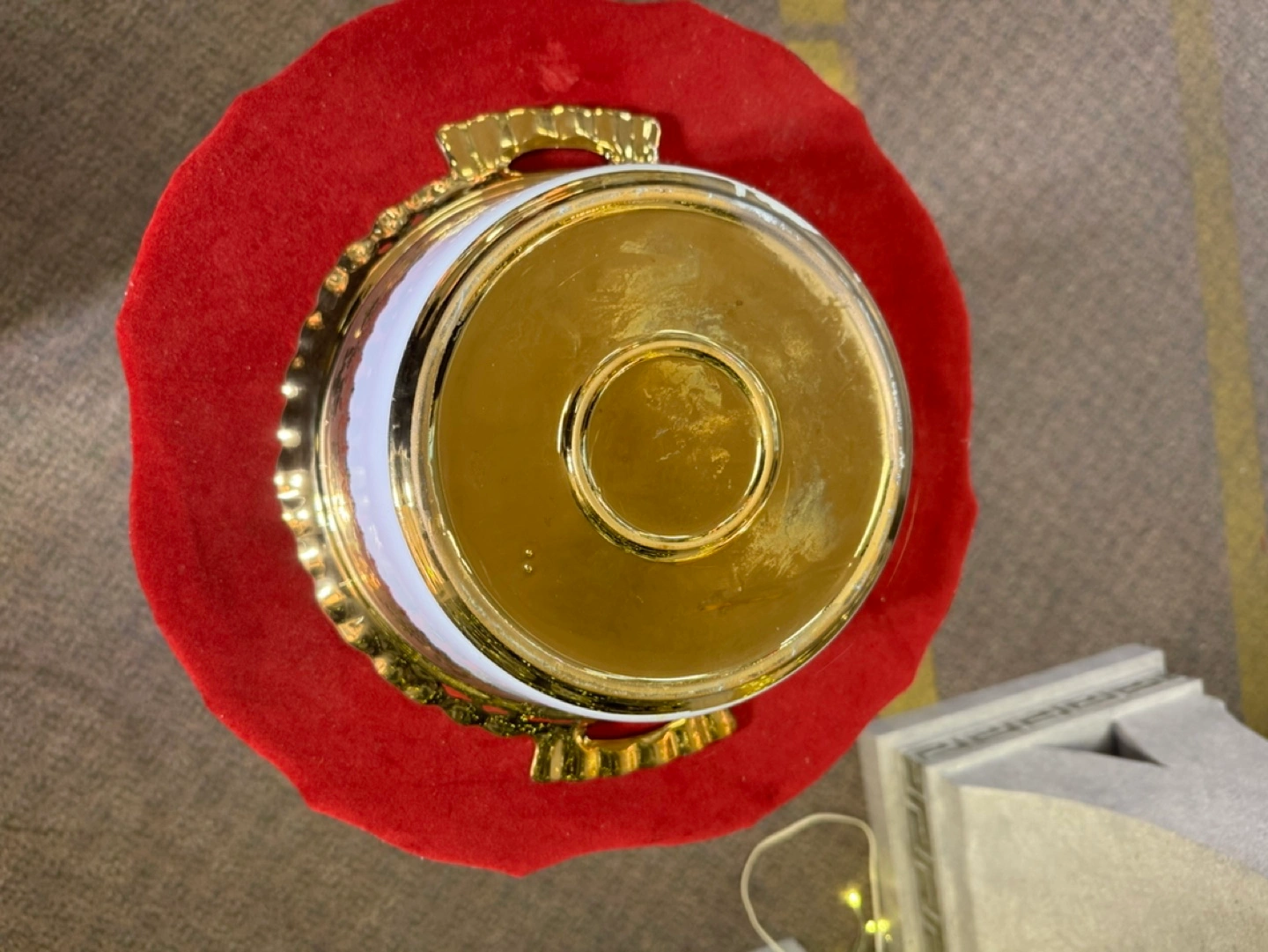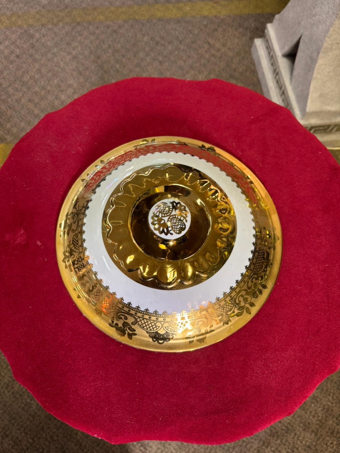 White ceramic serving bowl with gold accents. Includes a stand.Diameter 11.5 inch