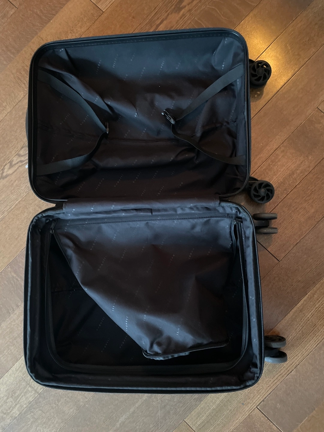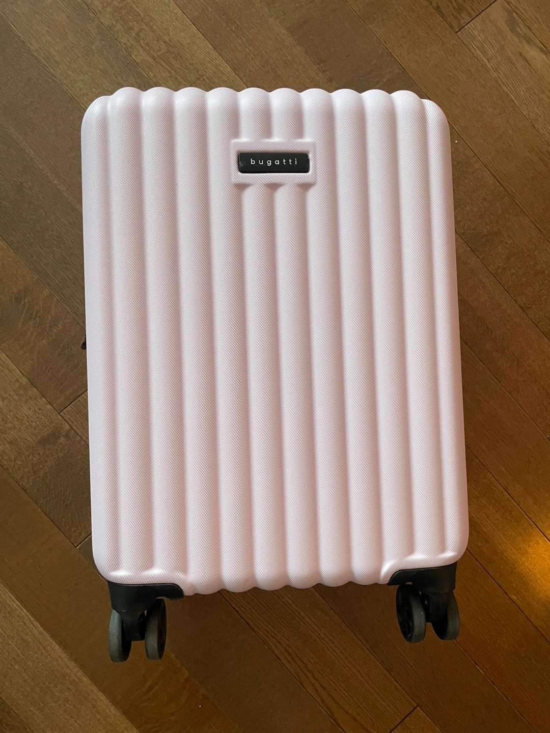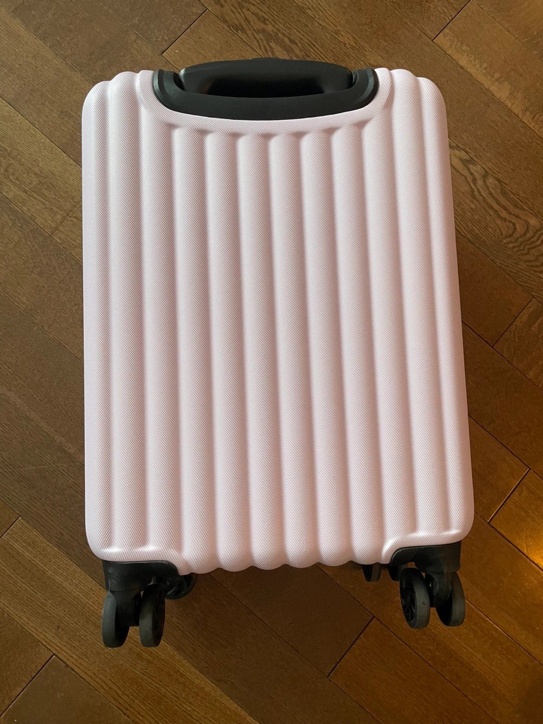 Pink carry-on suitcase with four wheels. It has a handle and an interior zippered pocket. Used only once. Received new luggage as a gift, do not need this one anymore. Is a pinky/purple colour. Purchased for $150.