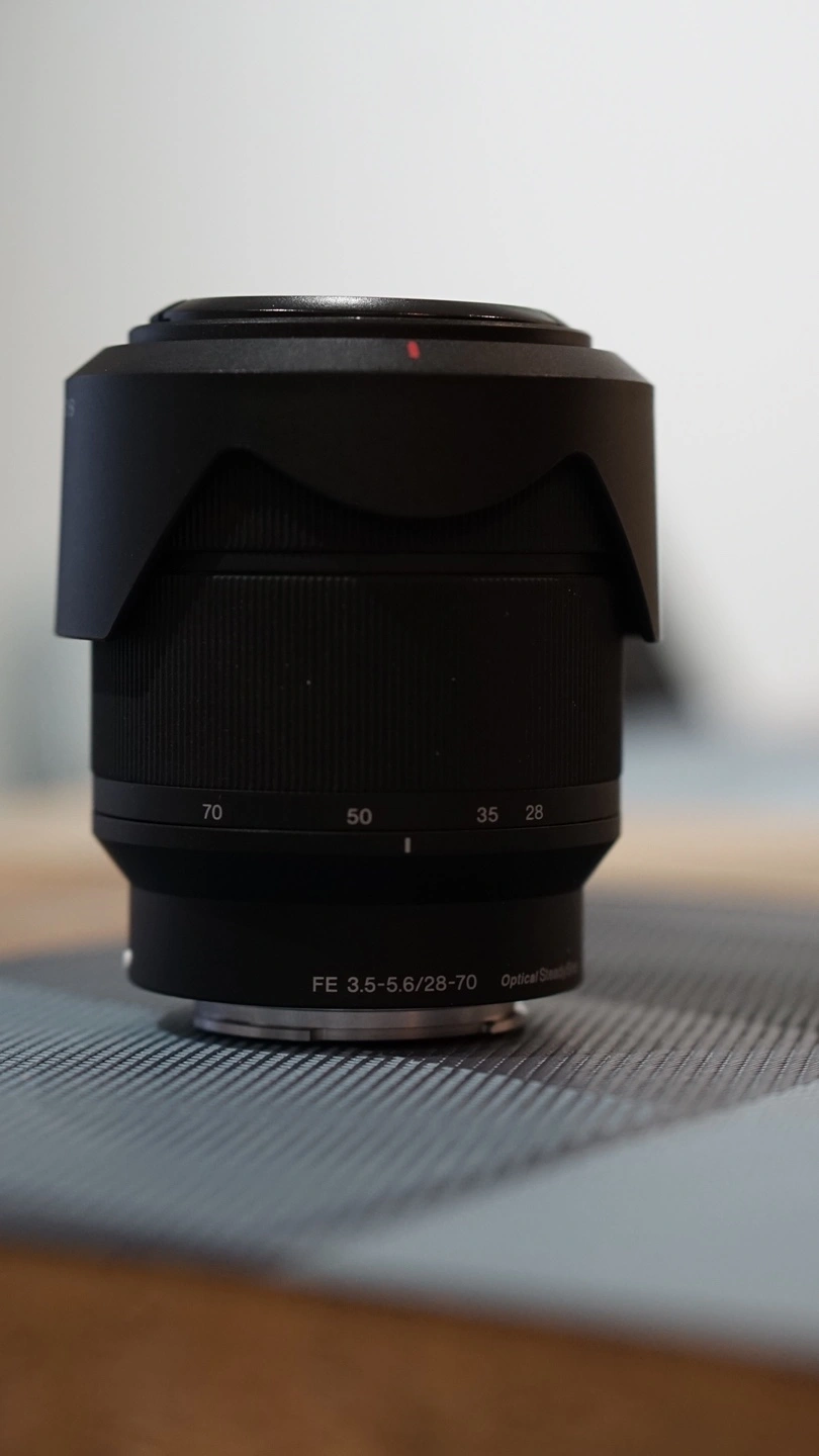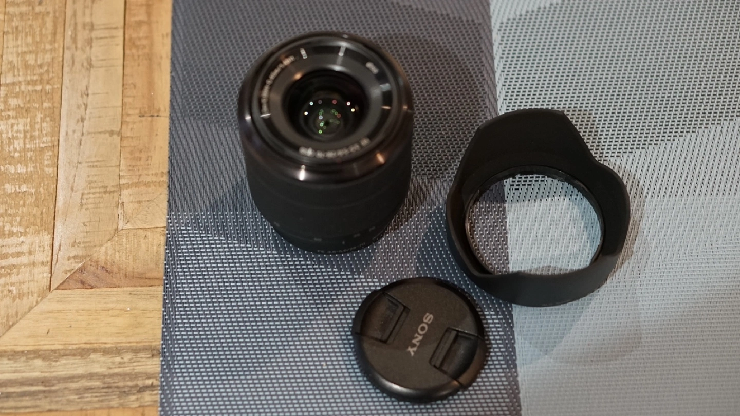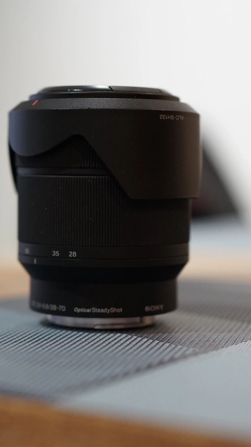 Sony E-mount lens with a 28-70mm focal length and Optical SteadyShot image stabilization. Includes lens cap and hood.