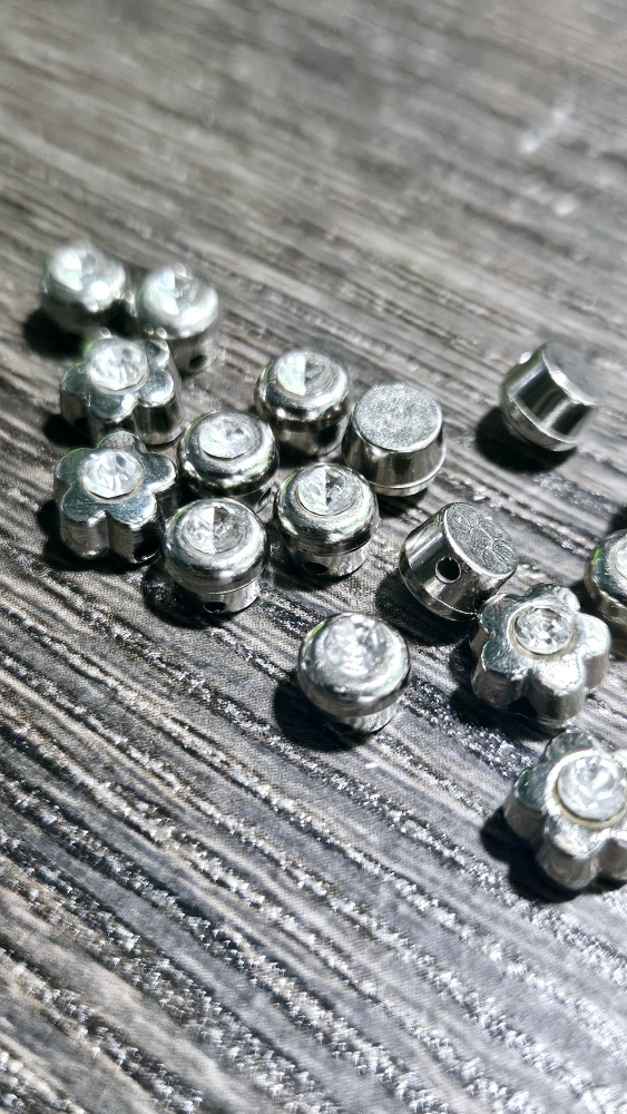 Silver coloured small beads with clear rhinestones. Some round and some shaped like flowers.