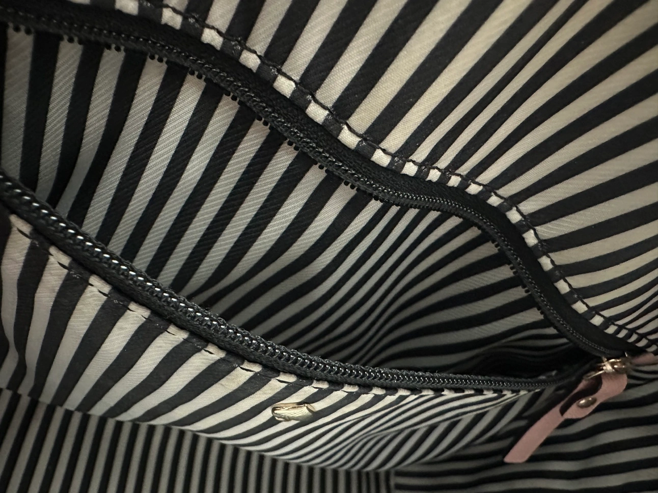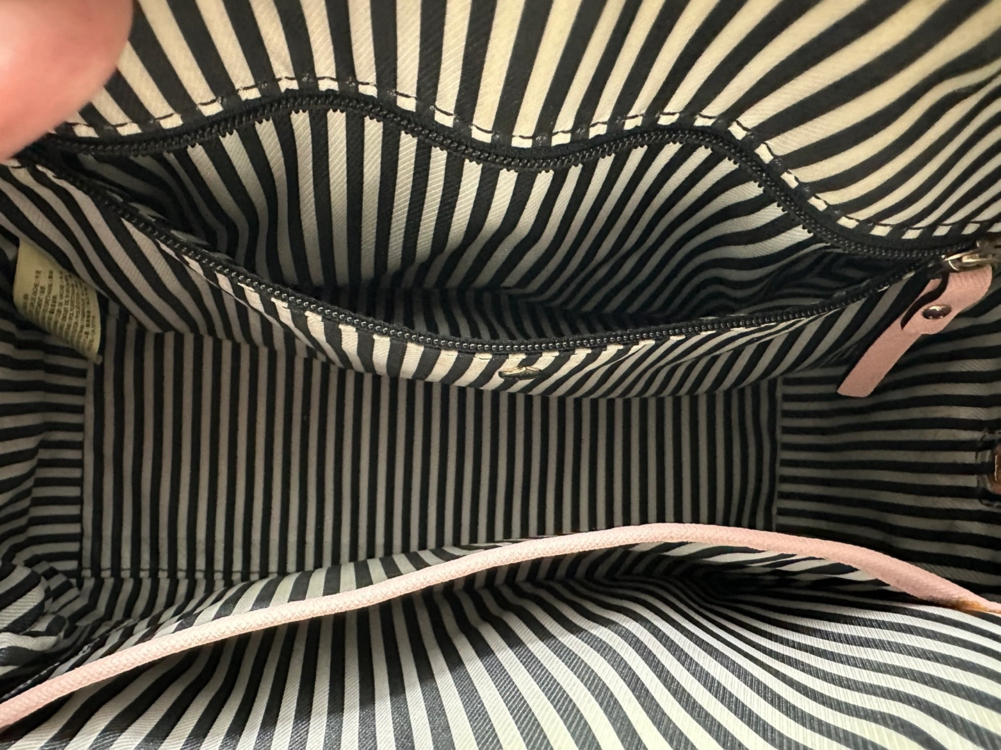With one zipped pocket and one open pocket inside (see photos # 3 & 4). Very roomy inside.
