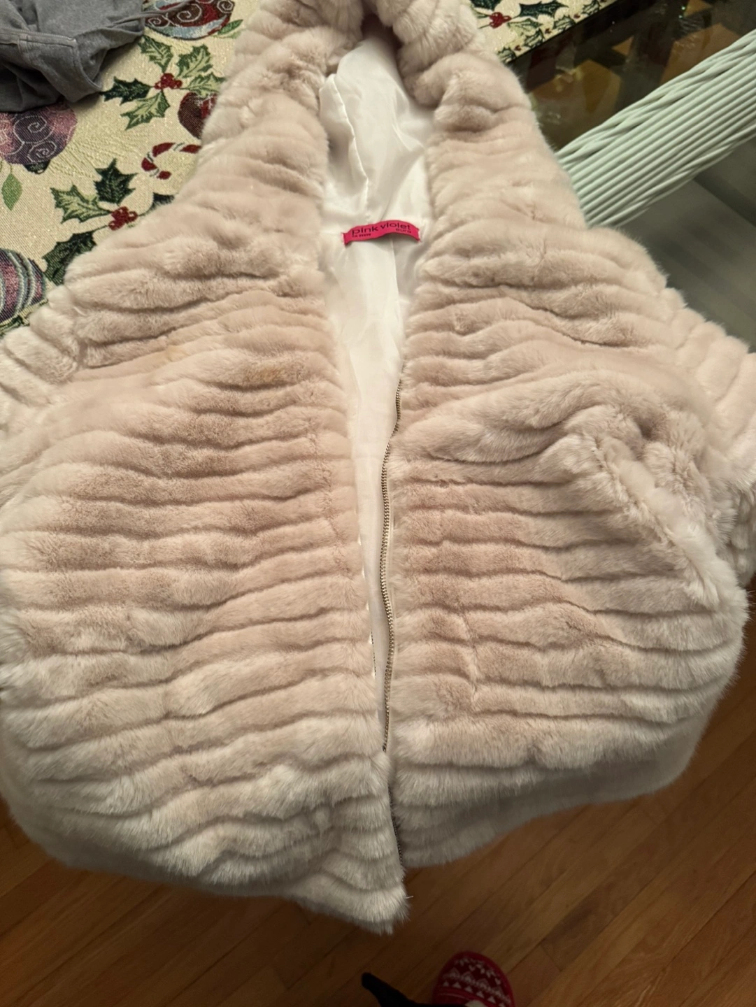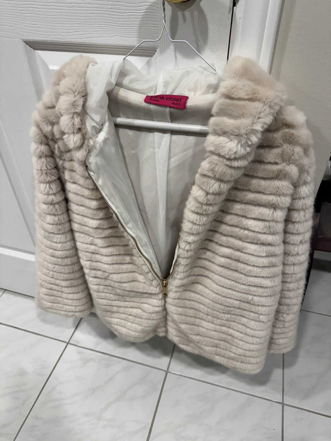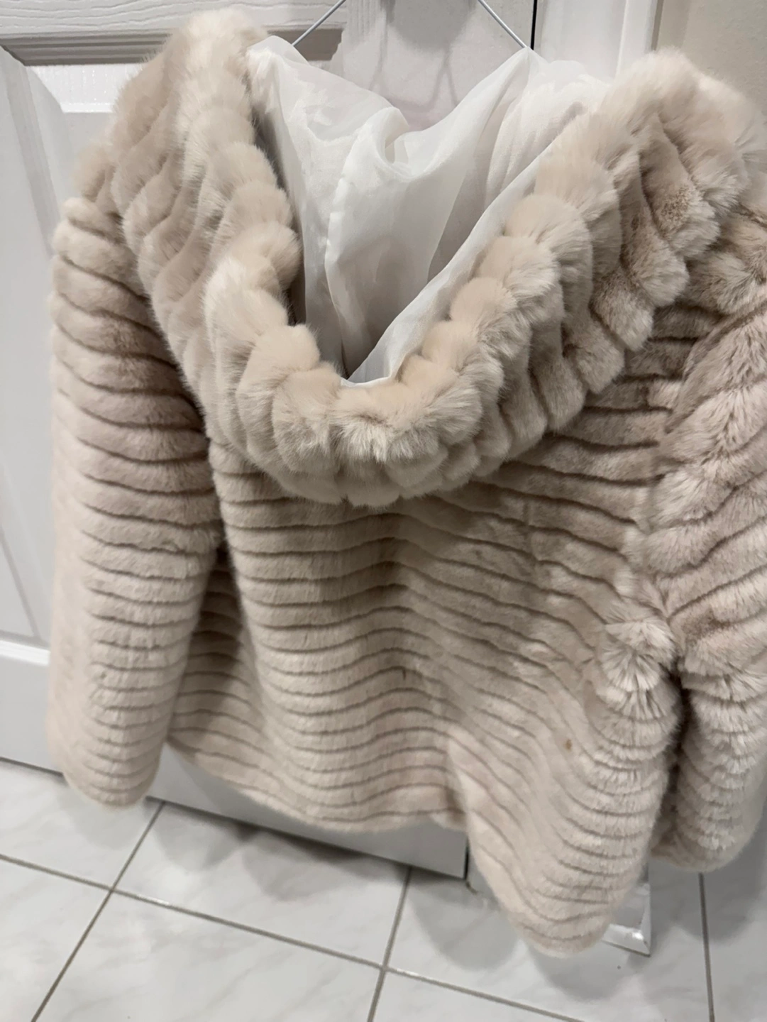 European fun fur coat, mid waist, comes with hood, colour cream white, soft silky feeling! Perfect cover up for the winter months