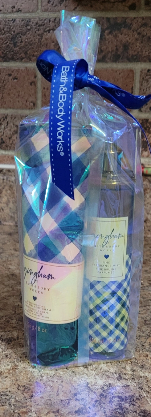 Gingham fragrance mist and body cream set. Both bottles are wrapped in clear plastic and tied with a blue ribbon.$10 each.