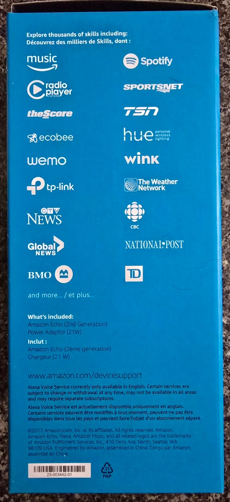 The 2nd generation Echo has a 2.5” downward-firing woofer and 0.6” tweeter powered by Dolby to deliver crisp vocals and dynamic bass throughout the room. You can play music from Amazon Music, Apple Music, Spotify, Pandora, SiriusXM, and more. With Amazon Music you can search by lyrics, time-period, or let Alexa pick the music for you. Set a music alarm to wake up to your favorite song or playlist. You can also listen to audiobooks from Audible, podcasts, radio stations, news briefs, and more.