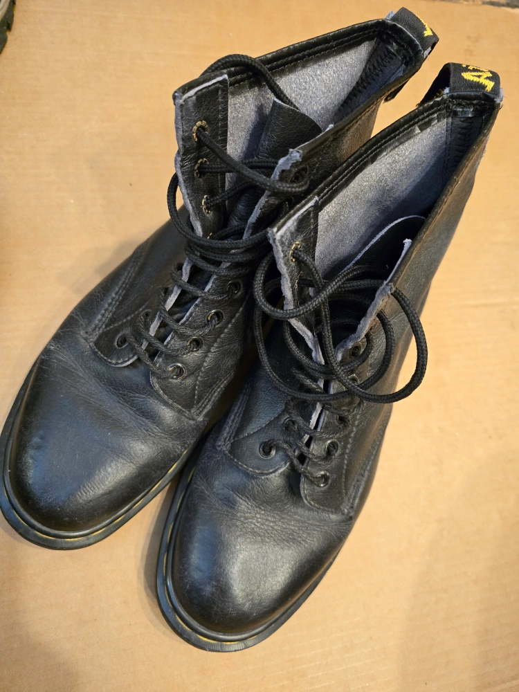 Black leather Dr. Martens boots. Size 10. Made in England. These are vintage. pre 2000. Tread is still good but there is some wear as can be seen in photo. Leather uppers are in stellar condition. Non smoking home.