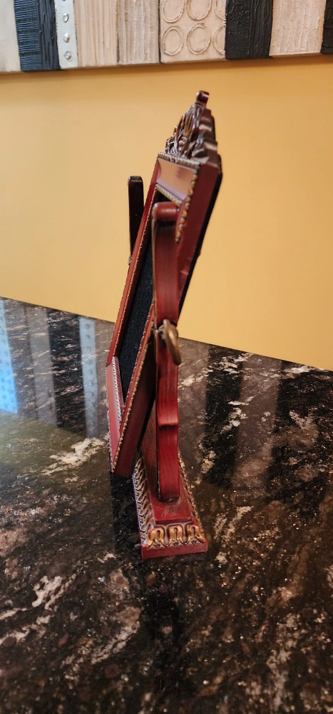 931Victorian-style picture frame. Boasts an ornate design with a brushed gold and red finish and a velvet backing for the perfect antique look. Set on a swivel standing easle frame to capture the perfect angle. NOTE: Missing glass.