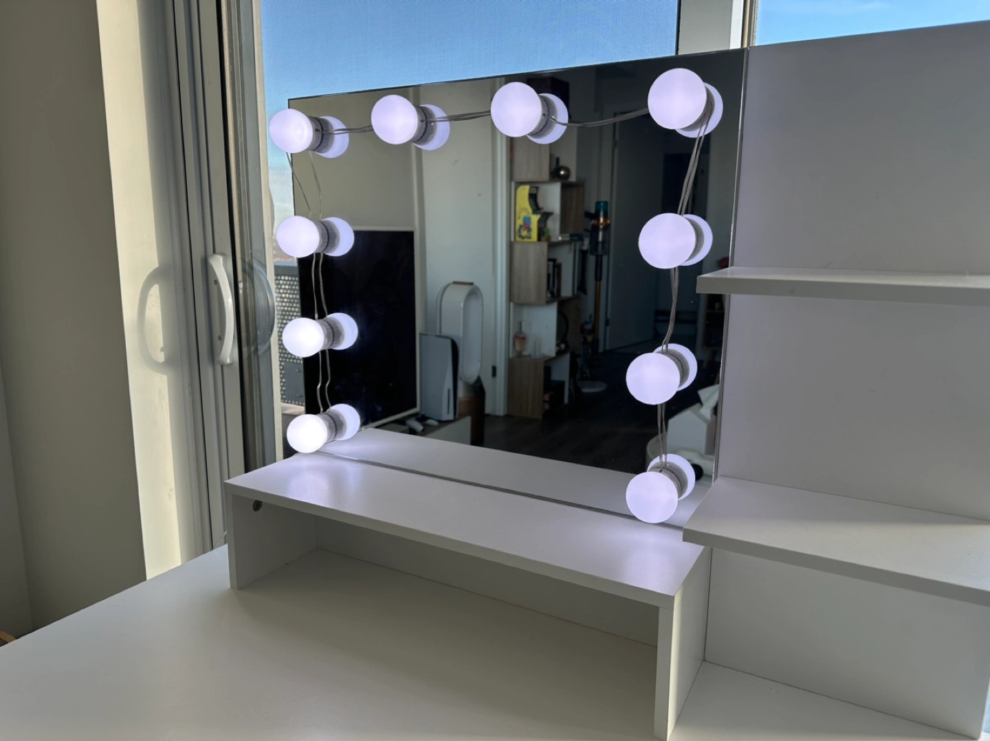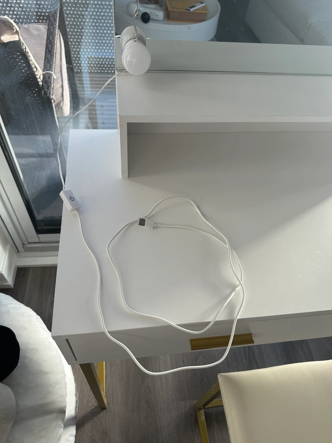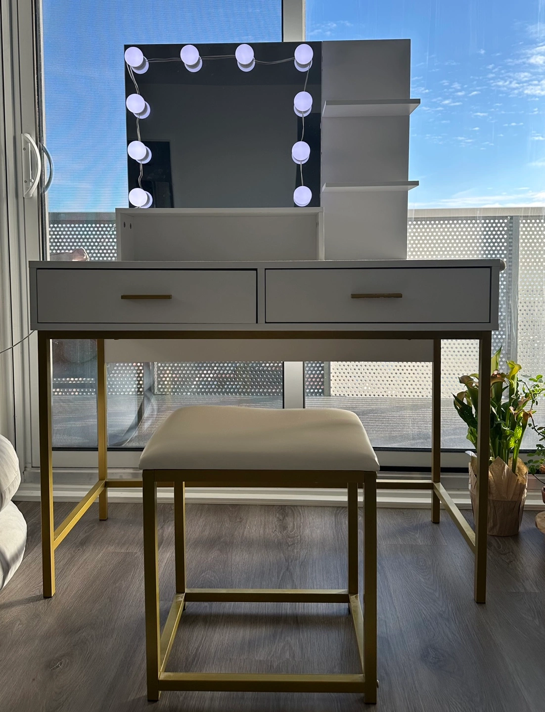 Bought from Wayfair in Dec 2022. Grenica Vanity (Gold / White) White vanity with a Hollywood-style mirror and lightbulbs (USB powered), two drawers, and a matching stool. Gold accents on the hardware and legs. ! The gold coating with one of the drawer pulls has peeled off a little bit, pls note. The overall measurements (for the vanity desk) are as in the last 3 images. For detailed measurements (including stool), pls DM me. Price is negotiable. Open to any offers! Only available for pickup at Downtown Toronto (Harbourfront)