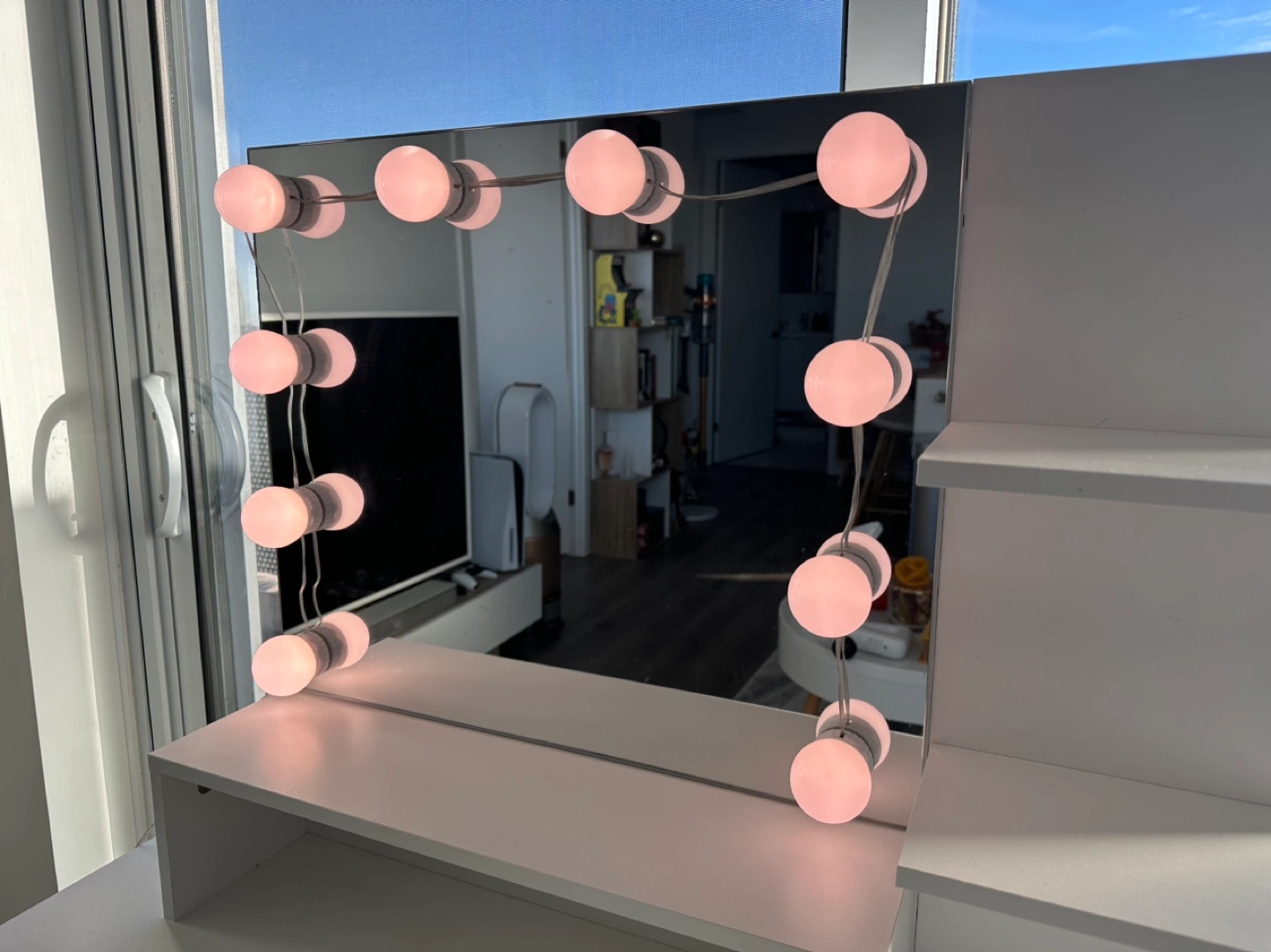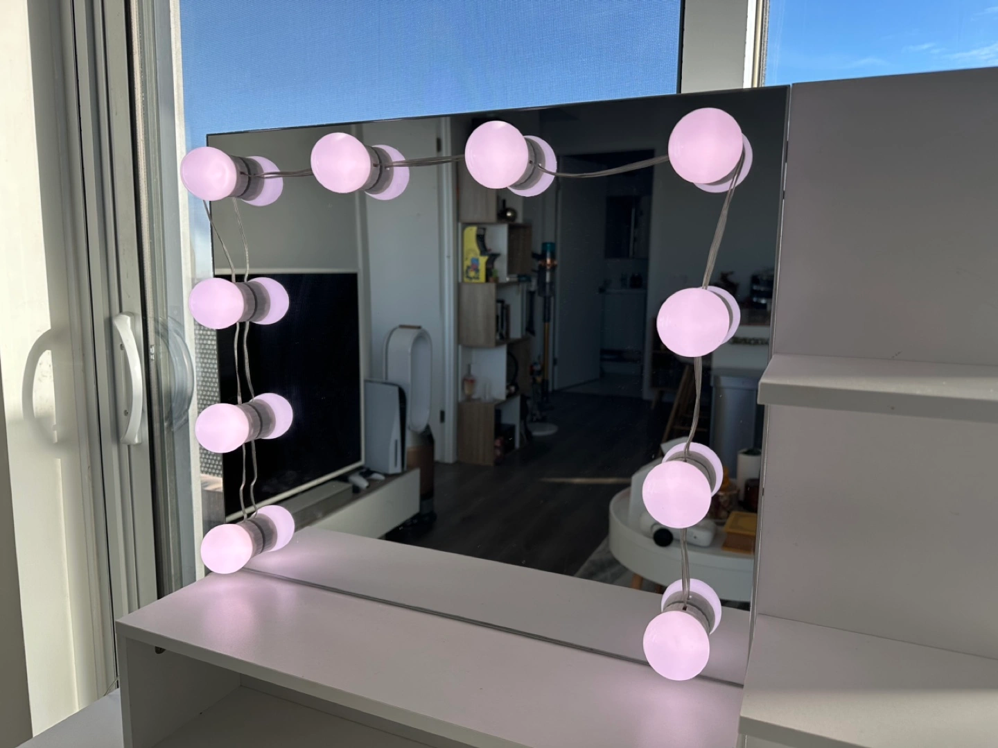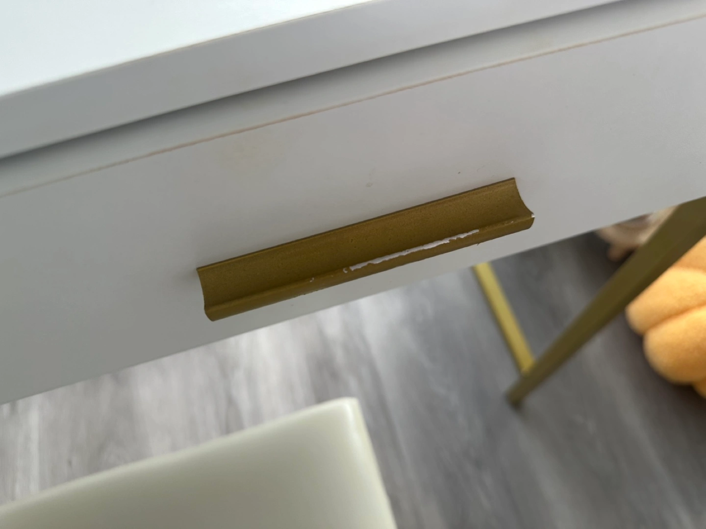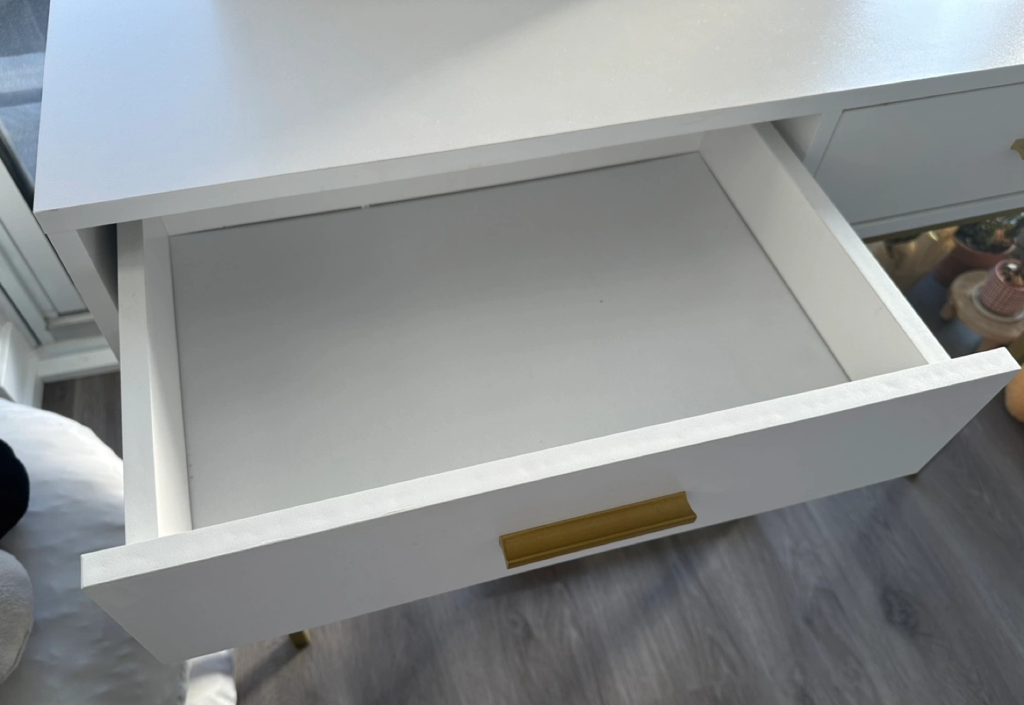 Bought from Wayfair in Dec 2022. Grenica Vanity (Gold / White) White vanity with a Hollywood-style mirror and lightbulbs (USB powered), two drawers, and a matching stool. Gold accents on the hardware and legs. ! The gold coating with one of the drawer pulls has peeled off a little bit, pls note. The overall measurements (for the vanity desk) are as in the last 3 images. For detailed measurements (including stool), pls DM me. Price is negotiable. Open to any offers! Only available for pickup at Downtown Toronto (Harbourfront)