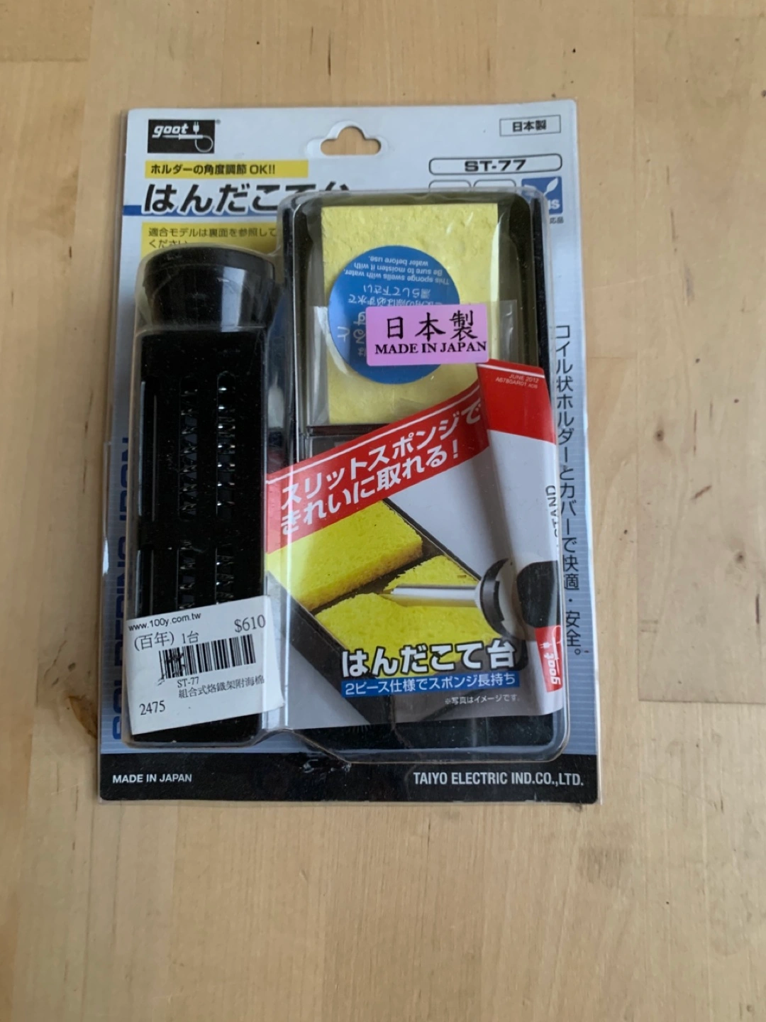 Goot soldering iron stand with a sponge for cleaning the soldering iron tip. The stand is designed for easy access and stability. Comes with a spare sponge. Made in Japan.