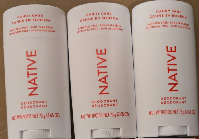 NATIVE Deodorant Candy Cane scent. Paraben and aluminum free. Effective, long lasting odor protection. New and unopened. All 3 for $25 or $9 each.